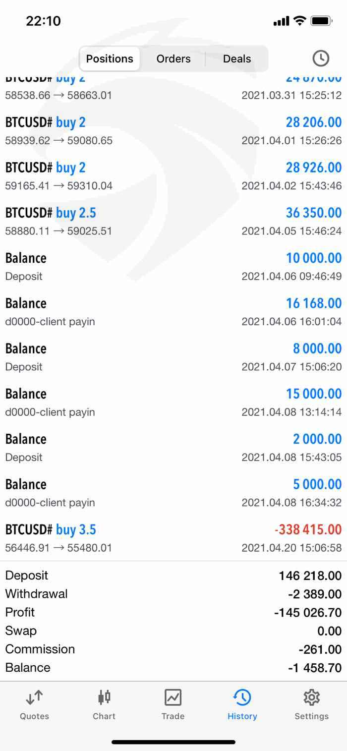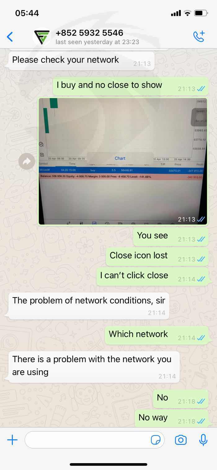 ฉันพบสาวชาวฮ่องกงผ่าน dating app เธอชวนฉันลงทุนกับโบรกเกอร์นี้ ลงทุนมาได้ 2 อาทิตย์ ต้องการถอนเงิน กลับถอนไม่ได้ โบรกเกอร์แจ้งว่าระบบตรวจพบว่าบัญชีต้องสงสัยฟอกเงิน ต้องจ่ายค่าประกัน 20% ของเงินทั้งหมด หลังจากจ่ายค่าประกันครบ ก็ยังถอนเงินไม่ได้ ต้องทำการเทรดก่อน พอเทรดพบปัญหาสั่งปิดการขายไม่ได้ เพราะปุ่มปิดหายไป ราคาล่วงจนบัญชีติดลบ แจ้งปัญหาทางโบรกเกอร์อ้างว่าเกิดจาก network ของฉัน