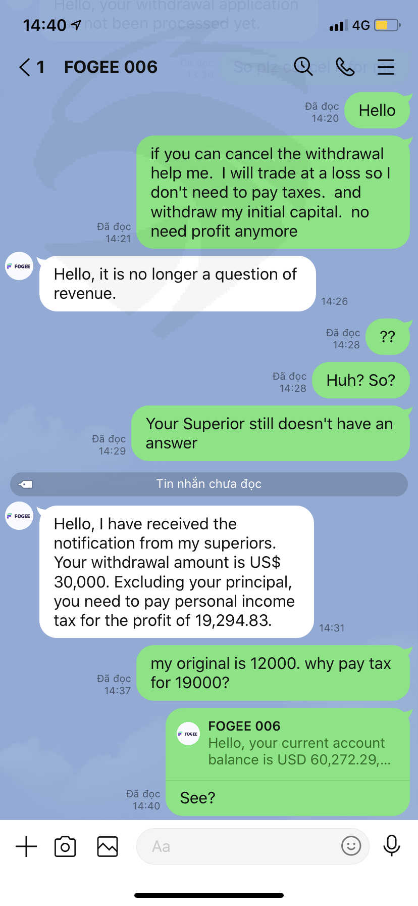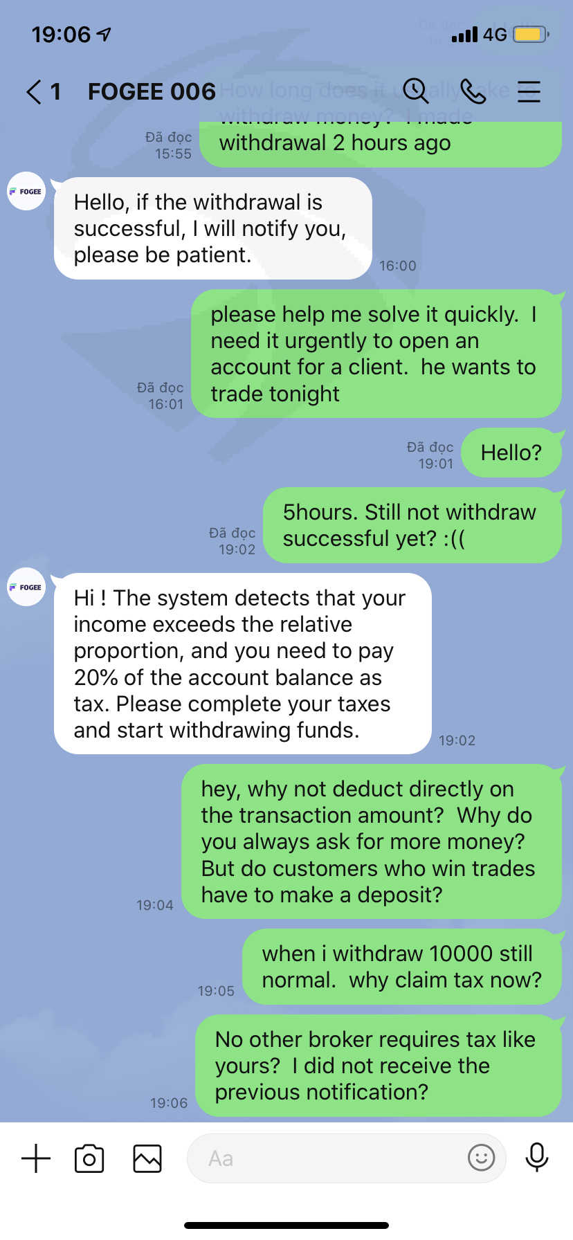 khi tôi giao dịch nhỏ, hoặc thua lỗ có thể rút tiền nhưng khi tôi thắng họ không đồng ý cho tôi rút tiền. yêu cầu đóng 20% thuế thu nhập cá nhân trước khi rút tiền. bắt đóng 30% số tiền phạt quản lý rủi ro.