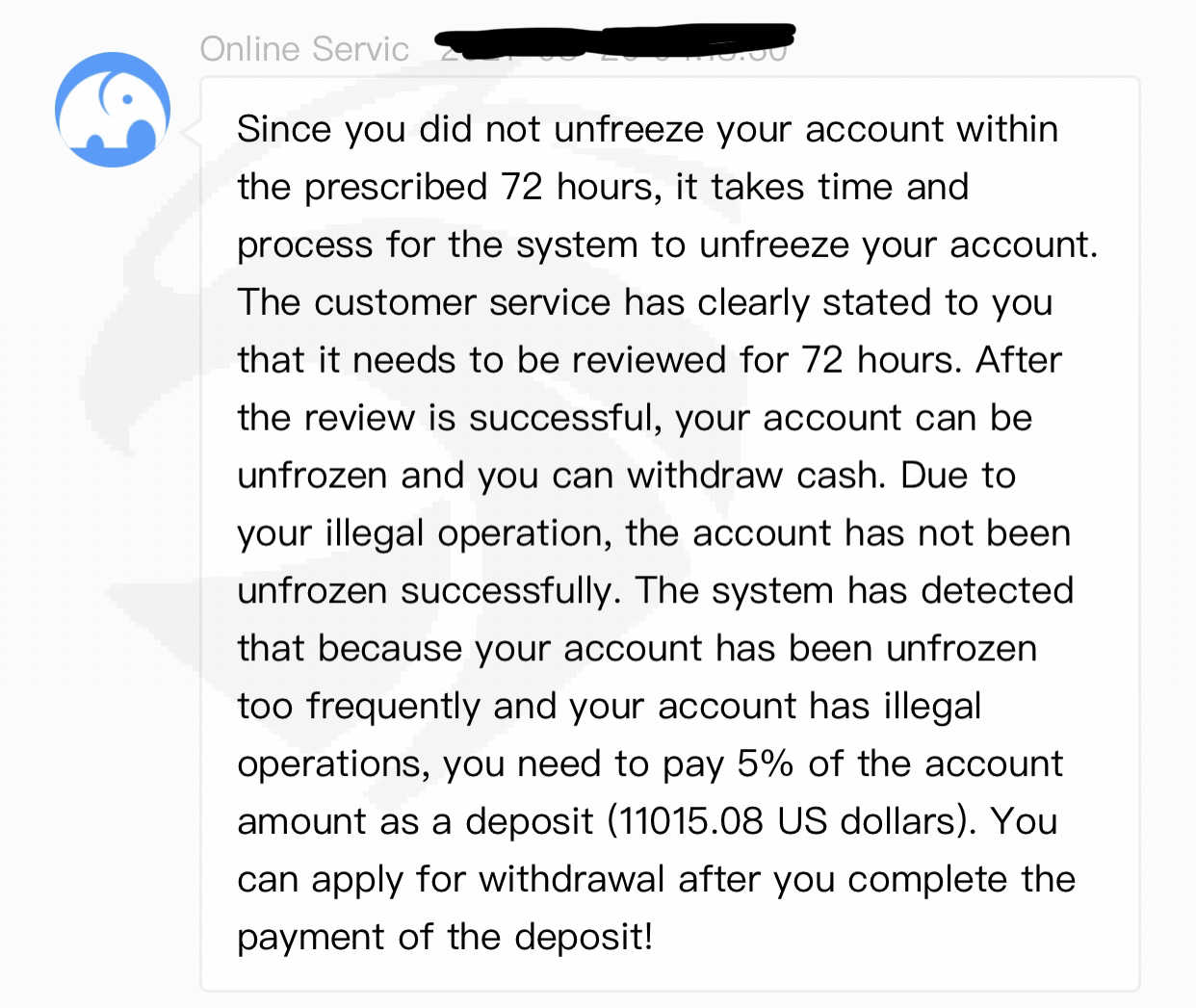 我申请出金时客户服务让我交 2% 的税,我支付了大约 5000 美元的税款(未从账户中的 220,000 中扣除),但由于在系统“72 小时”应用税款时间之前提交了提款请求,我收到了 11016 美元的罚款,帐户现在被冻结了 22 万美元,因为我没有 11000 美元来支付他们的罚款。