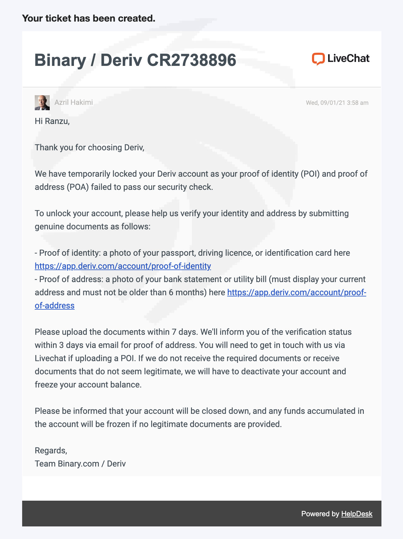DERIV when I request the money as an IB they blocked my wallet not letting withdraw. After my identity verified they ask proof of address, I send 3 different and they refuse all 3, saying they can t accept please send another. After I ask on live chat why they dont accept they say bad quality, I made perfect photo and send again they block my account with 12000$ and say they will not pay me! VERY BIG SCAMMER, dont trade on Deriv or you will never see your money! I see they do this everyday, please contact regulators so we can stop this scam and have our money back!!! my costumers also dont get paid profits. RUN AWAY OF THIS BROKER