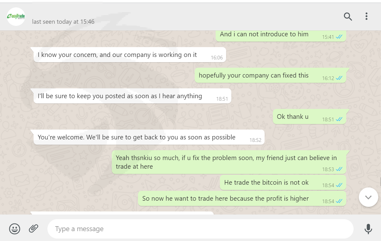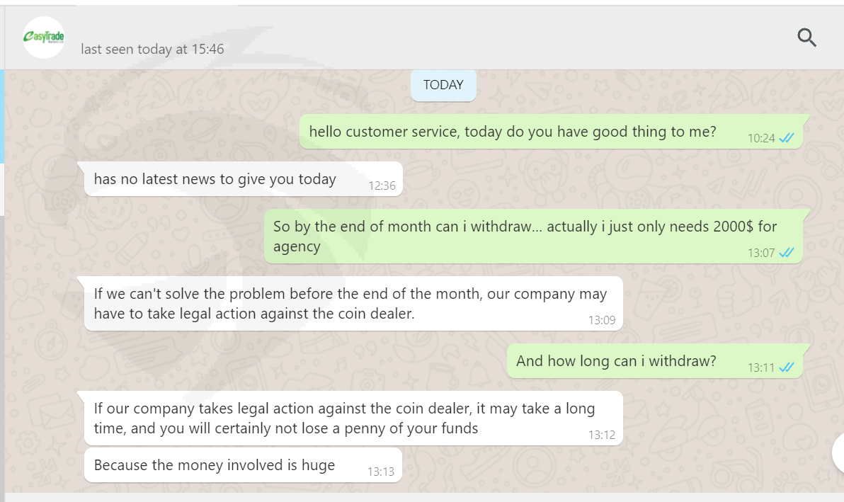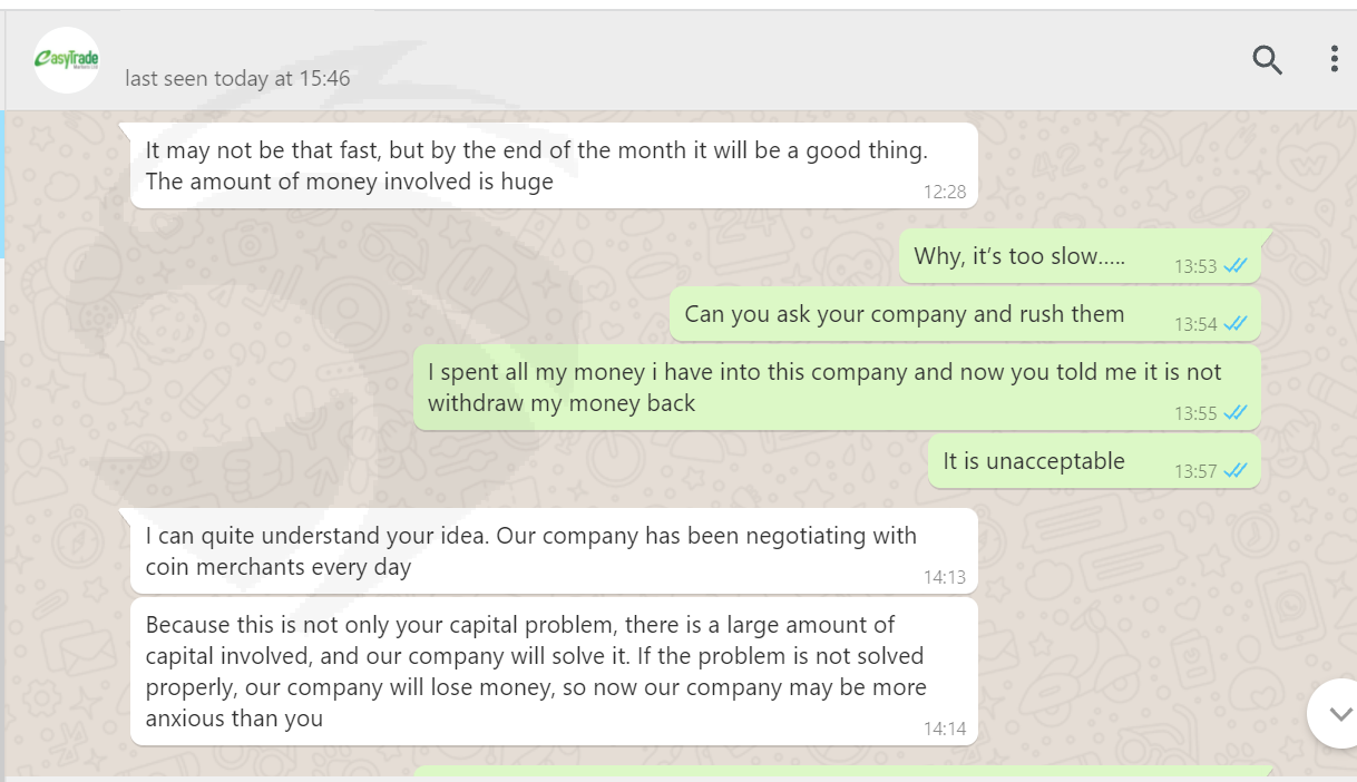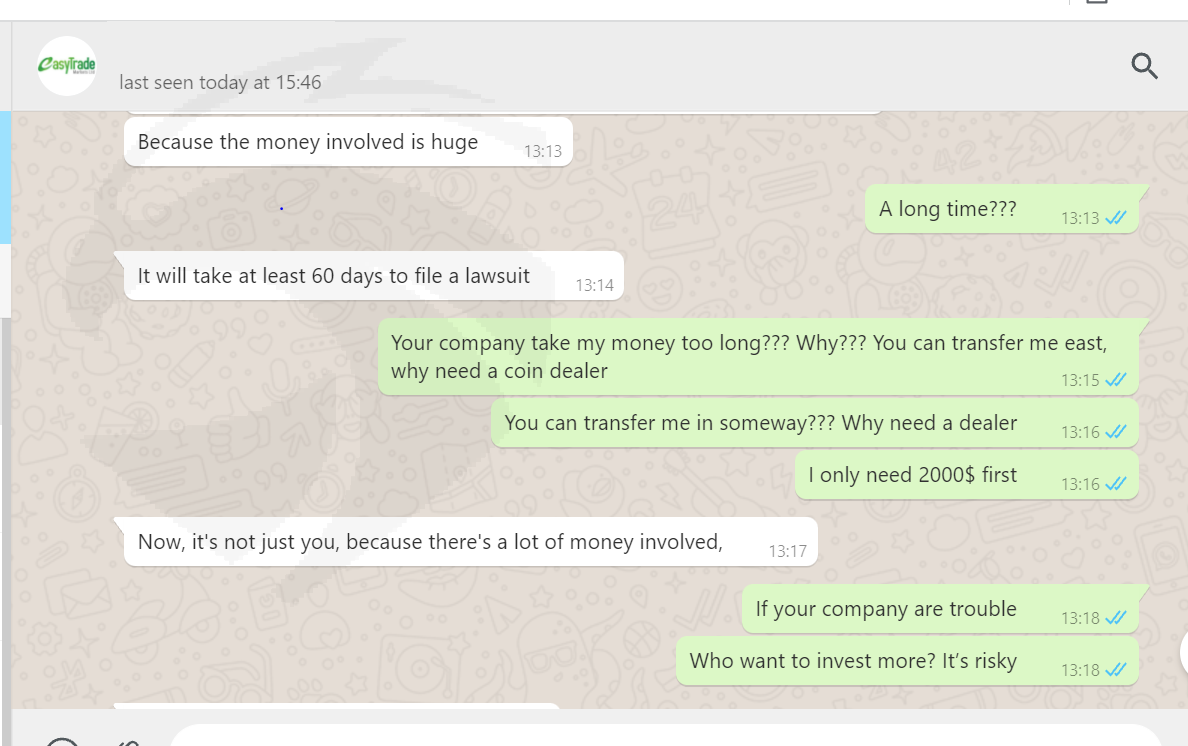 Đừng bao giờ giao dịch trên nền tảng này, đây là nền tảng lừa đảo, mới đầu họ sẽ nhờ một người giả dạng giàu có và kiếm được tiền từ nền tảng này với mỗi giao dịch lãi 100.000$ để nói chuyện lôi kéo mình vào, lúc đầu mình nạp tiền ít và vẫn có thể rút được tiền ra thoải mái. Sau khi mình cảm thấy tin tưởng vì rút được tiền,mình sẽ nạp nhiều tiền vào nhiều hơn, đến lúc cần, mình rút tiền ra thì nhân viên môi giới sẽ nói là hệ thống có vấn đề với coin dealer, công ty đang fix lỗi này, chưa thể rút tiền ra được. Và mình tiếp tục chờ, mặc dù trong tài khoản của mình có tiền nhưng các lệnh rút tiền đều ở trạng thái pending, hỏi thì tư vấn vẫn tiếp tục bảo chờ, và có thể sẽ phải chờ rất lâu để cty đàm phán với coin dealer và hứa tiền của mình sẽ không bị mất đâu này nọ. Tuy nhiên t đã chờ hơn 1 tháng và vẫn chưa thể rút được tiền về. Mặc dù vẫn còn tiền trên MT4 nhưng không thể rút về được vì vô vàn các loại lý do. lúc thì là hệ thống lỗi, lúc thì là nghỉ lễ, lúc tôi quay sang hỏi chỉ có Việt Nam bị như thế, các nước khác có rút được không thì bảo vẫn rút bình thường, tôi mới bảo vậy tôi sẽ rút tiền sang tài khoản của nước khác. Nhưng họ lại nói là cả kể thế tôi có thể vẫn không rút được tiền. TÓm lại rất nhiều lý do không rút được tiền/. Đừng ai như tôi bị bọn chúng lừa nữa nhé. Tôi đã mất hơn 13.000$ vào đây và giờ hối hận không được.