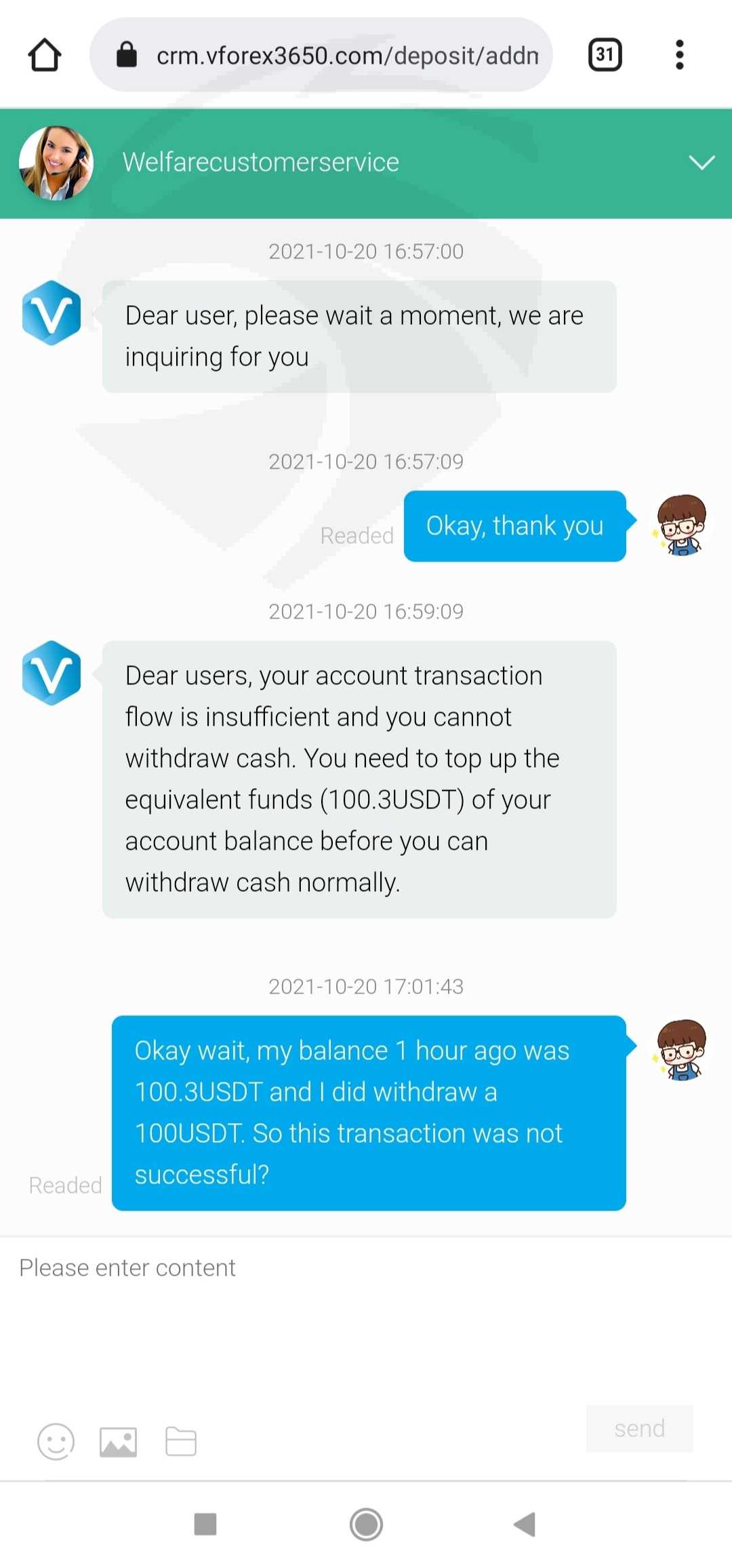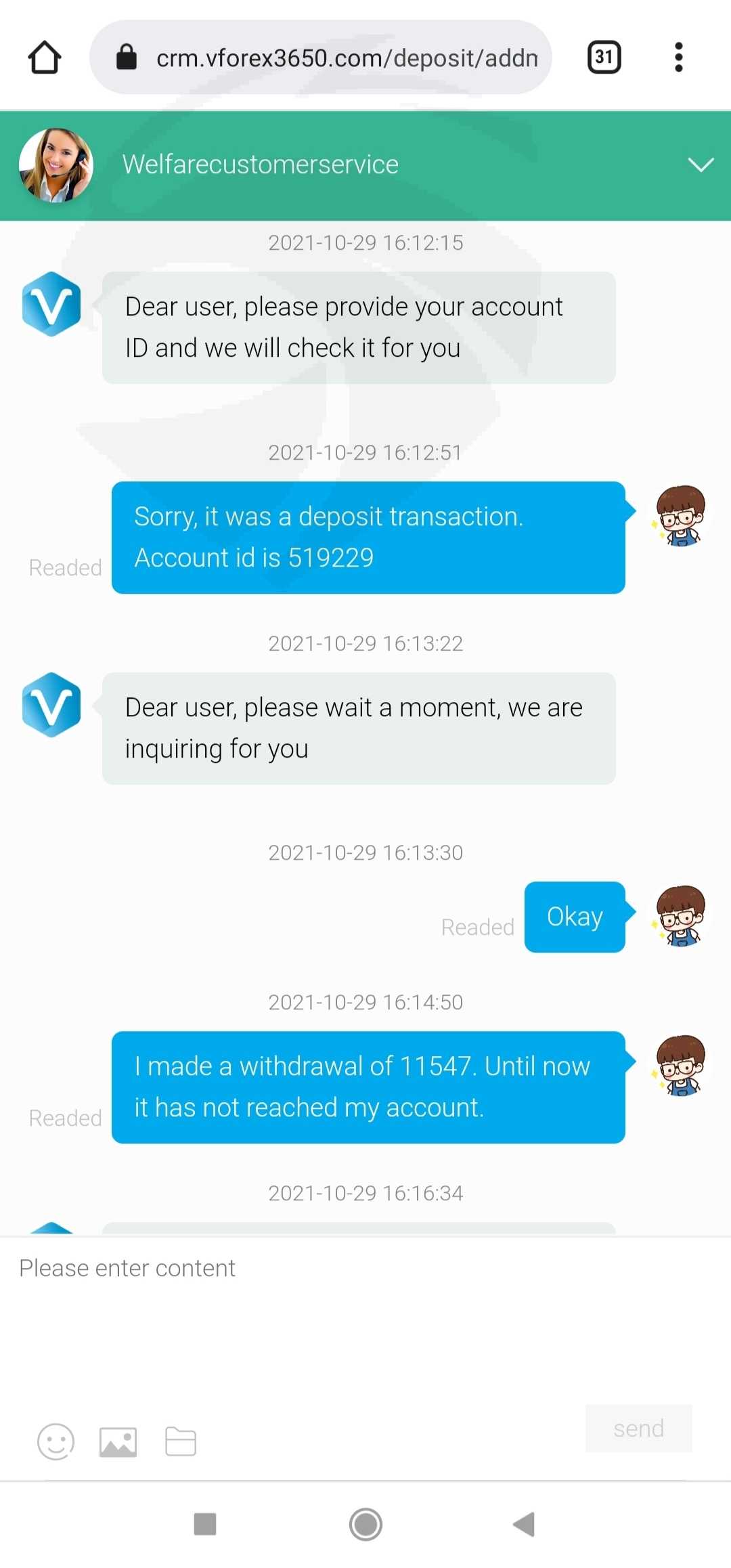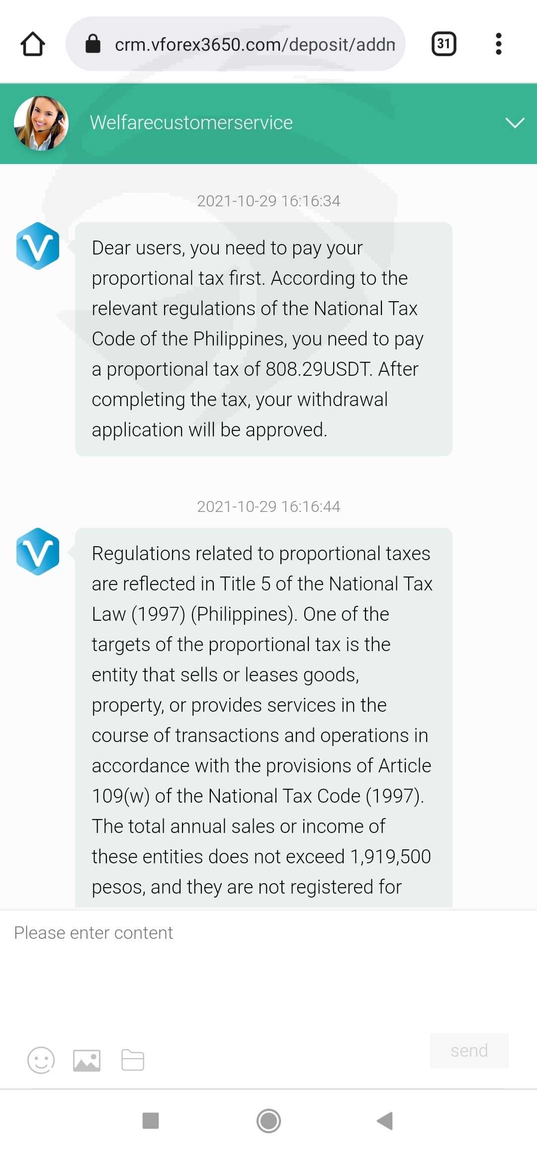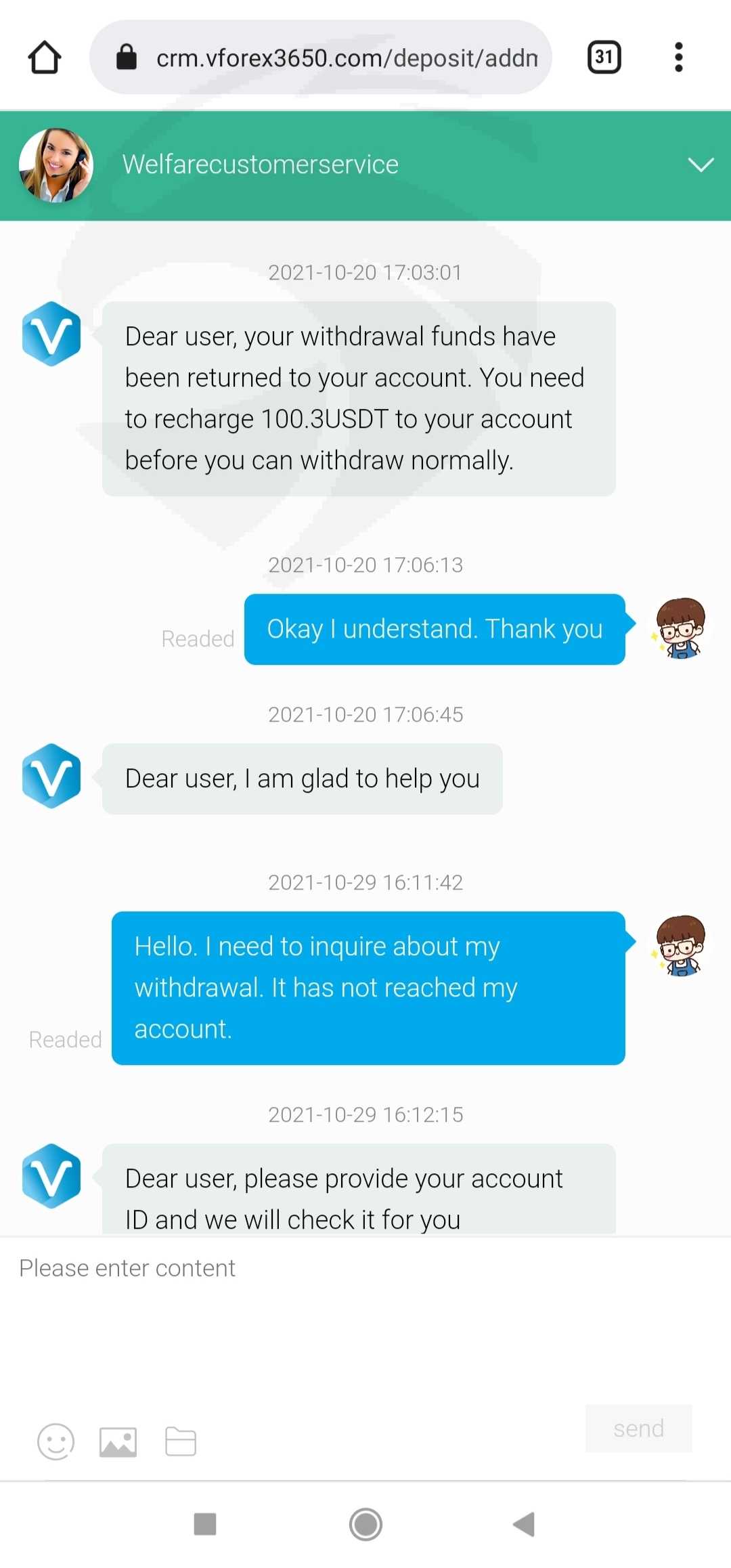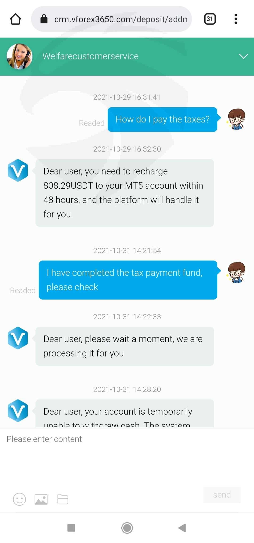 这个平台是我男朋友介绍给我的。我的第一笔存款是 196 美元,收入是 221.3 美元,我提取了 121 美元,成功了。然后我把余额 100 美元提了出来,但没有成功,客服说我需要用等值的账户充值。我又存了 289 美元、593 美元和 9003.98 美元。但是现在我无法提取所有的钱$ 11547,他们要求我纳税但仍然无法提取。请帮我拿回钱。