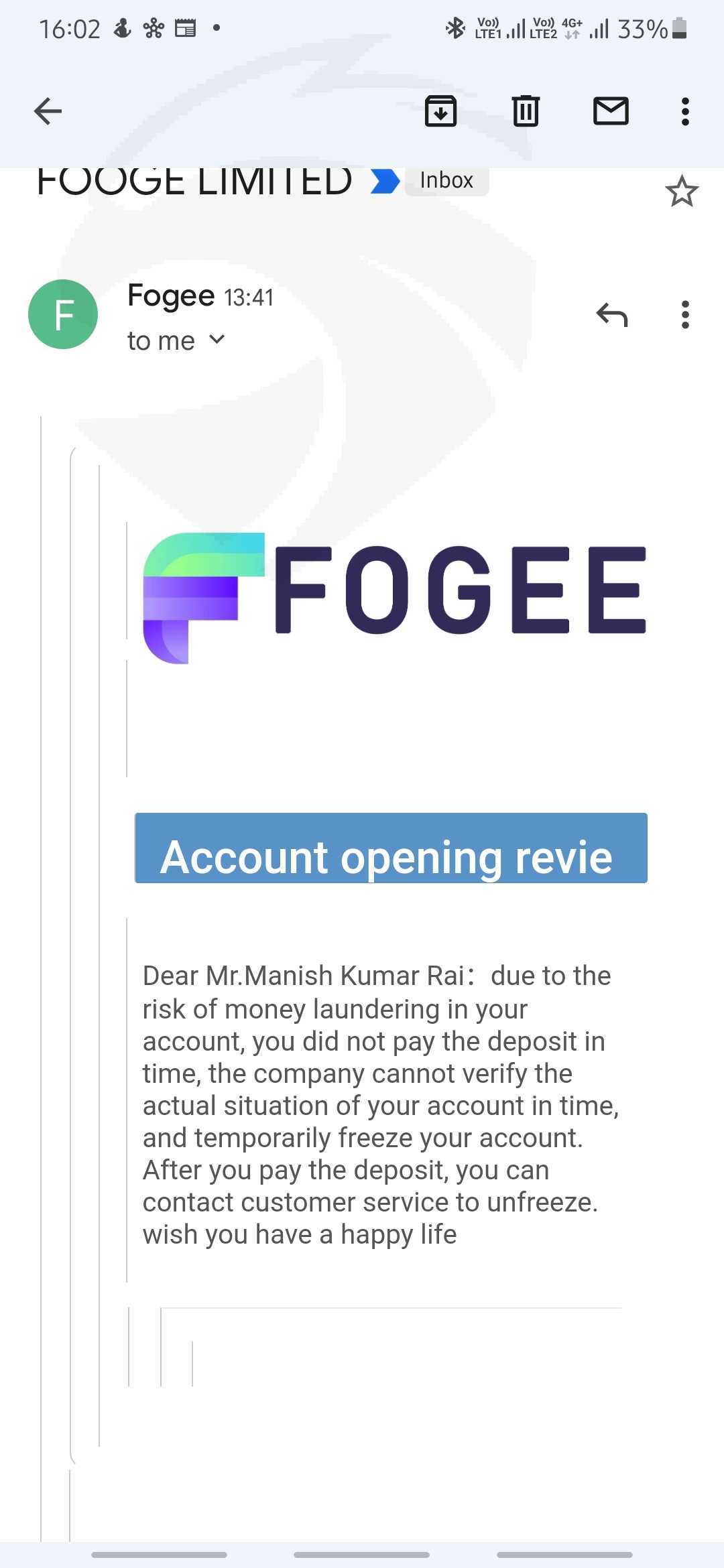 few days back I received unknown WhatsApp and being well wealthy she told me to help in commodity trading open account with fogee on mt5 and in few days make profit approx 37000usd when I request for withdraw some amount she given customer service manager no and that Manager ask me for tax 30% of total withdraw after some negotiation I change my plan and ask for withdraw only 200usd and paid 62 usdt as tax after some time he denied that fund not received and your account freeze