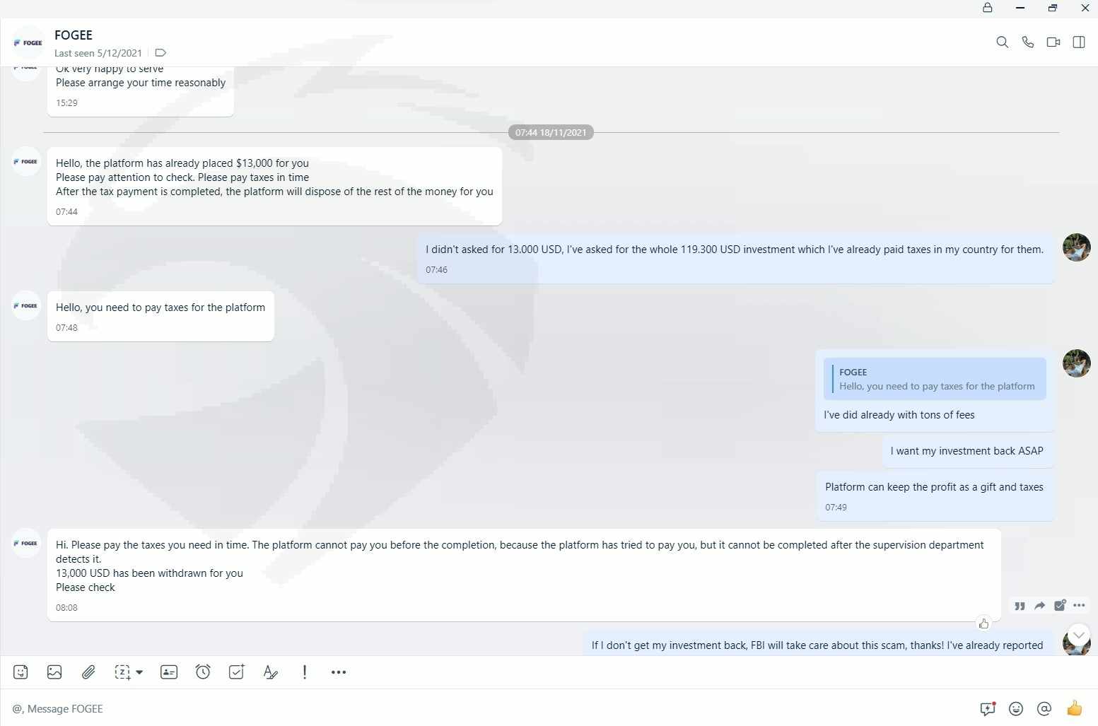 我在社交媒体上认识了一个人,并被介绍为交易员,这引导我访问并从 2021 年 8 月 11 日起在FOGEE LTD 平台投资了 119.300 美元。从那以后,我通过 ZALO和 https://www.FOGEE .vip/index.html与这个人进行了几次交易。第一个事件发生在这个 ZALO“客服”要求我用33.000 美元的金额分两次付款(20.000 美元和 13.000 美元)来解冻我的账户。这笔交易完成后,这位ZALO“客服”要求我再支付20.000美元以出金。付款完成后,这位ZALO“客服”再次要求我支付20.100美元的税款。当时,我做了一个研究,我意识到这是一个骗局。所有交易均在越南进行。我有与FOGEE有限公司和那个人谈话的所有证据、证据和信息。