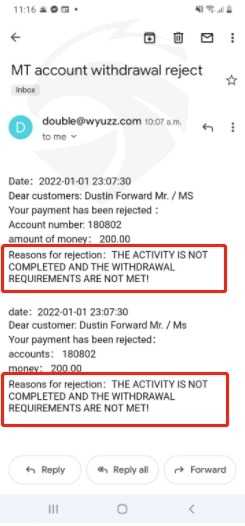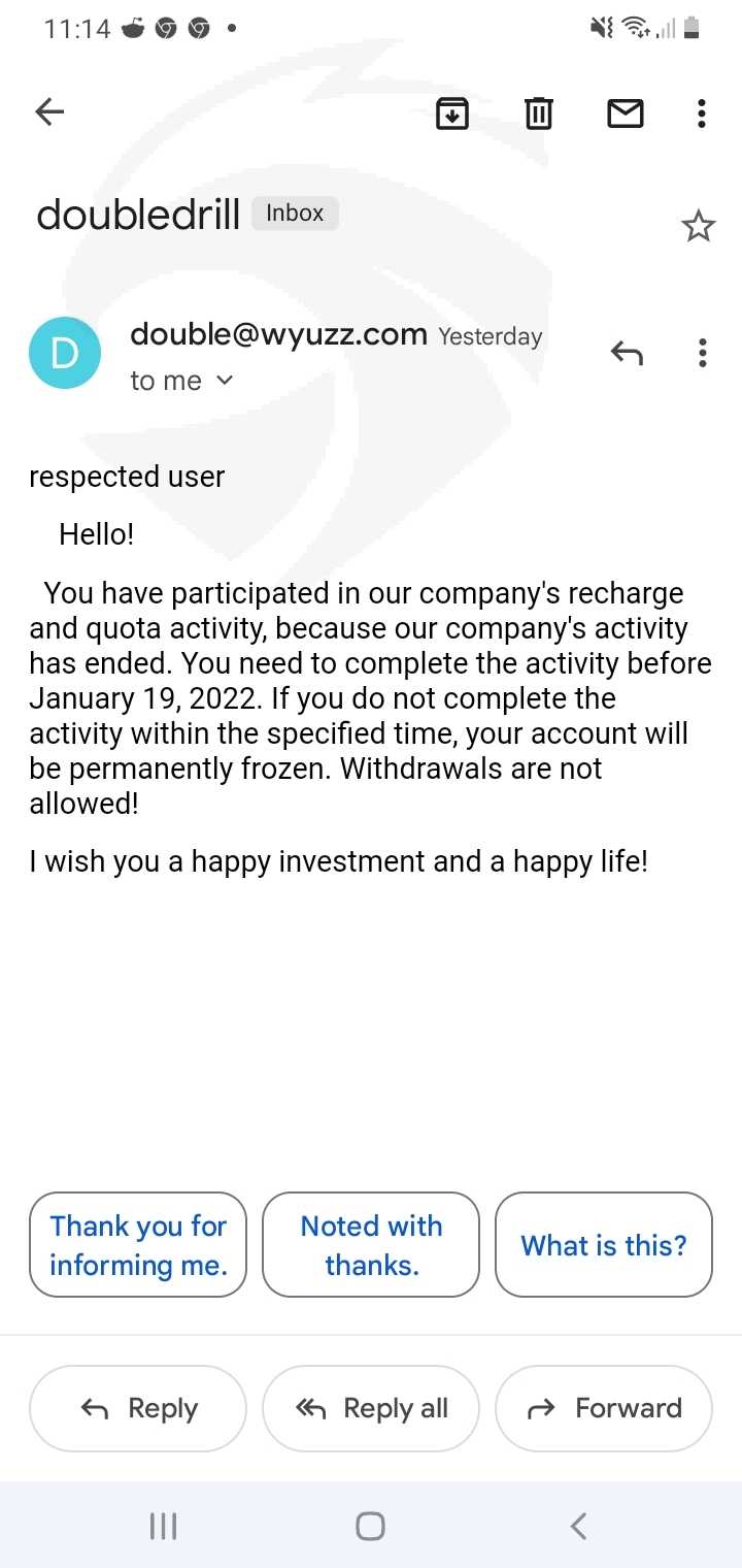 做过几笔交易DOUBLE DRILL LIMITED。他们在未经我允许的情况下为我注册了一个奖励计划,我所做的只是询问有关它的信息,接下来我知道的就是他们威胁要冻结我的帐户,除非我支付 10000 美元。他们从我这里得到了 2000 美元。我截图了他们发给我的电子邮件和他们的客户服务信息。
