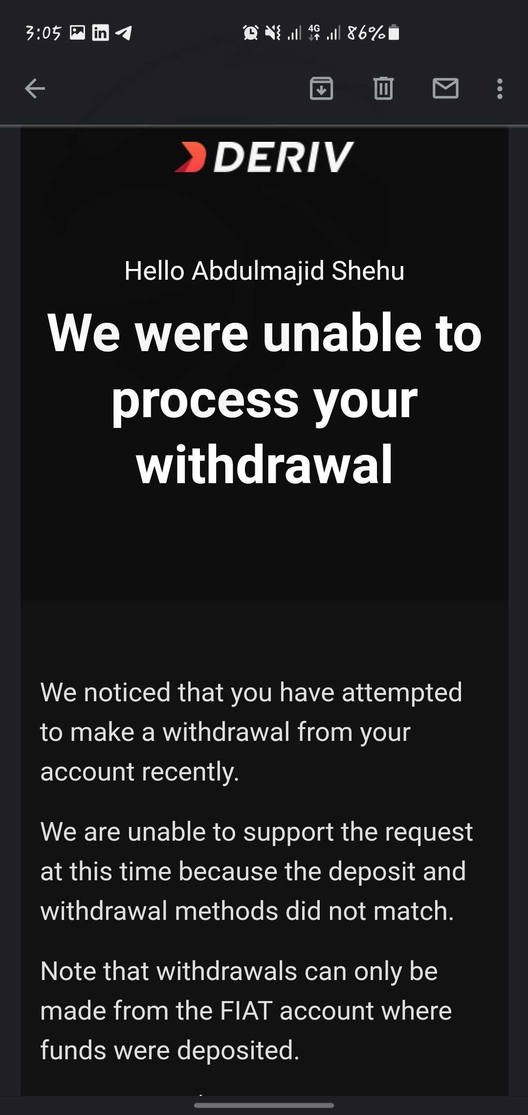 Deriv is just scam, at first they will allow you to withdraw to fell satisfied with them, while Later I realized it was just a rubbish, after trading and lost so much money I applied for withdrawal but got rejected all the time, claiming that I have to trade more. and saying my withdraw means doesn't match. Which is all liars!