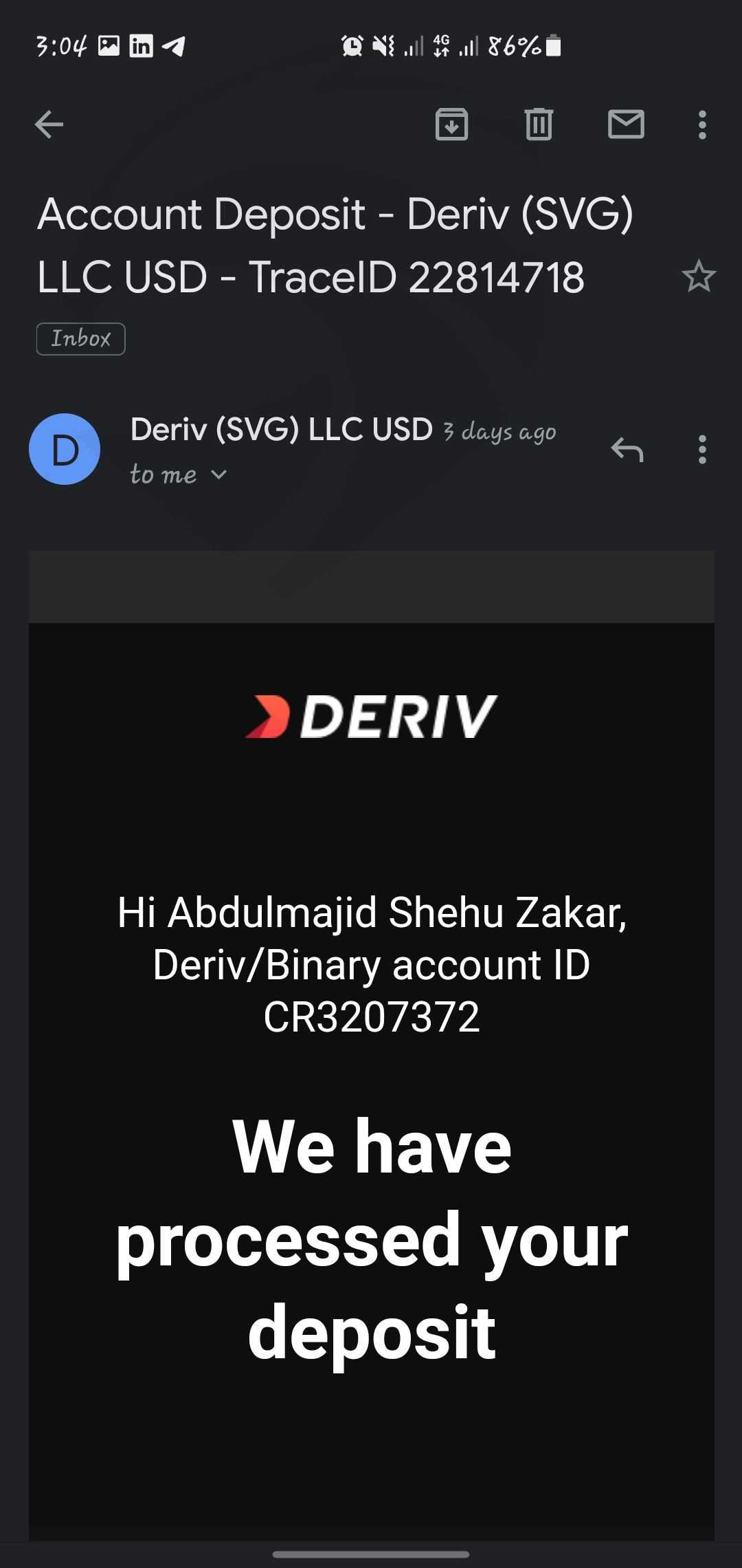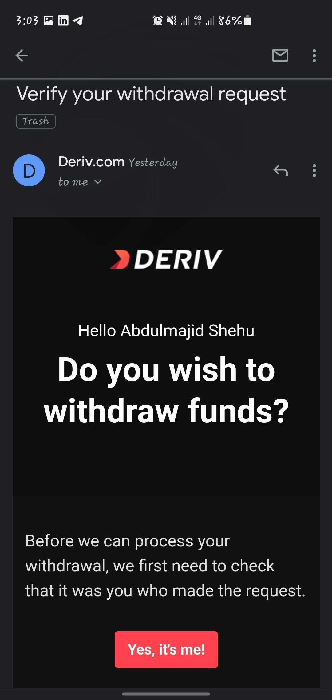 Deriv只是个骗局,一开始他们会允许你提现来让你感到满意,后来我发现这只是垃圾,交易后损失了这么多钱,我申请提现却一直被拒绝,声称我必须进行更多交易。并说我的退出方式不匹配。都是骗子!