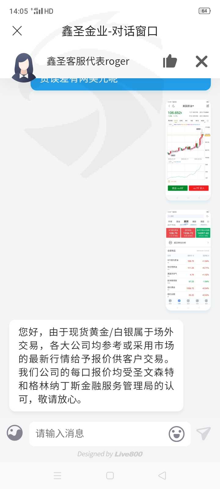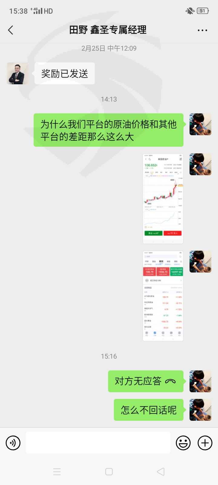 我在鑫圣金业,五年间前后入金四十多万人民币,每次入金后,一下单就往相反方向走,都直接爆仓,直到今天,突然发现这个平台的wti原油和其他的原油价格相差一两美元,我问客服,客服说是每个系统不同,问客服经理,客服经理不回话,每次说充值,客服经理就回话了,我怀疑这个是套牌平台