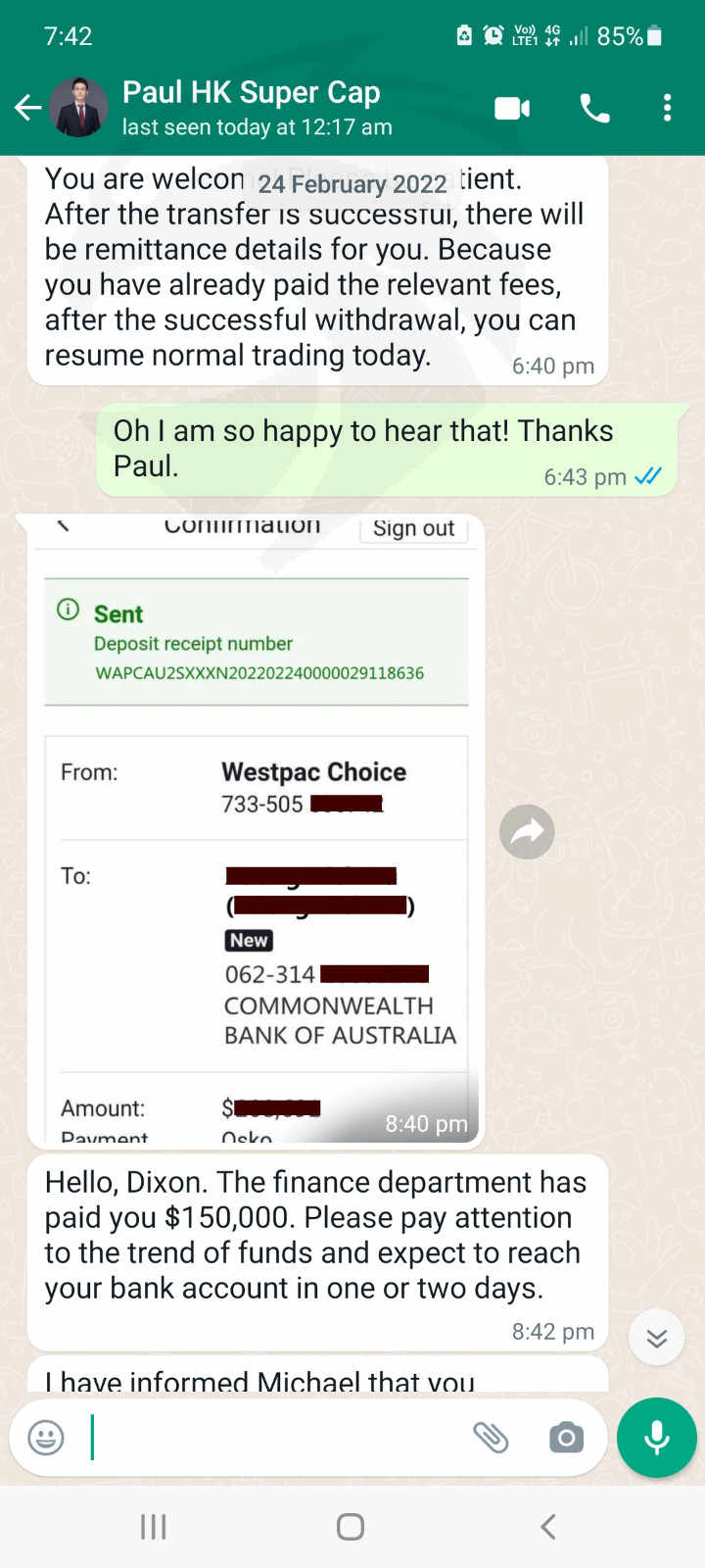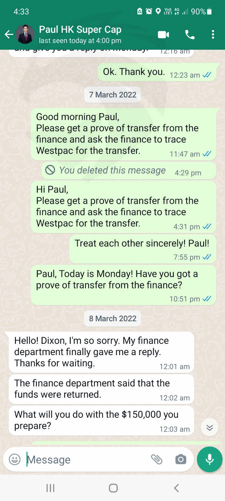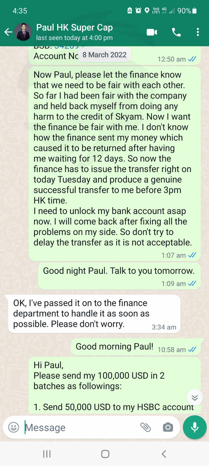 2022年2月24日,我收到了一张从Skyam Invest提取 150,000 美元的转账截图。我等了12天,资金还是没有到我的账户!2022年3月8日,Skyam的保罗通知我资金已退还,并询问我想用这笔资金做什么。我希望财务部门今天将资金重新转我的账户,因为它自2022年2 月24日以来已延迟超过 2 周。