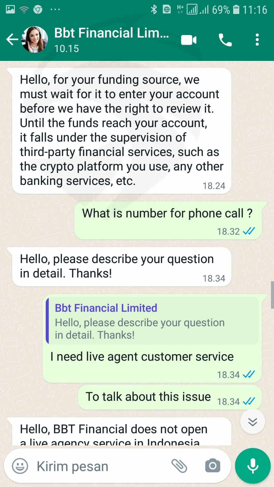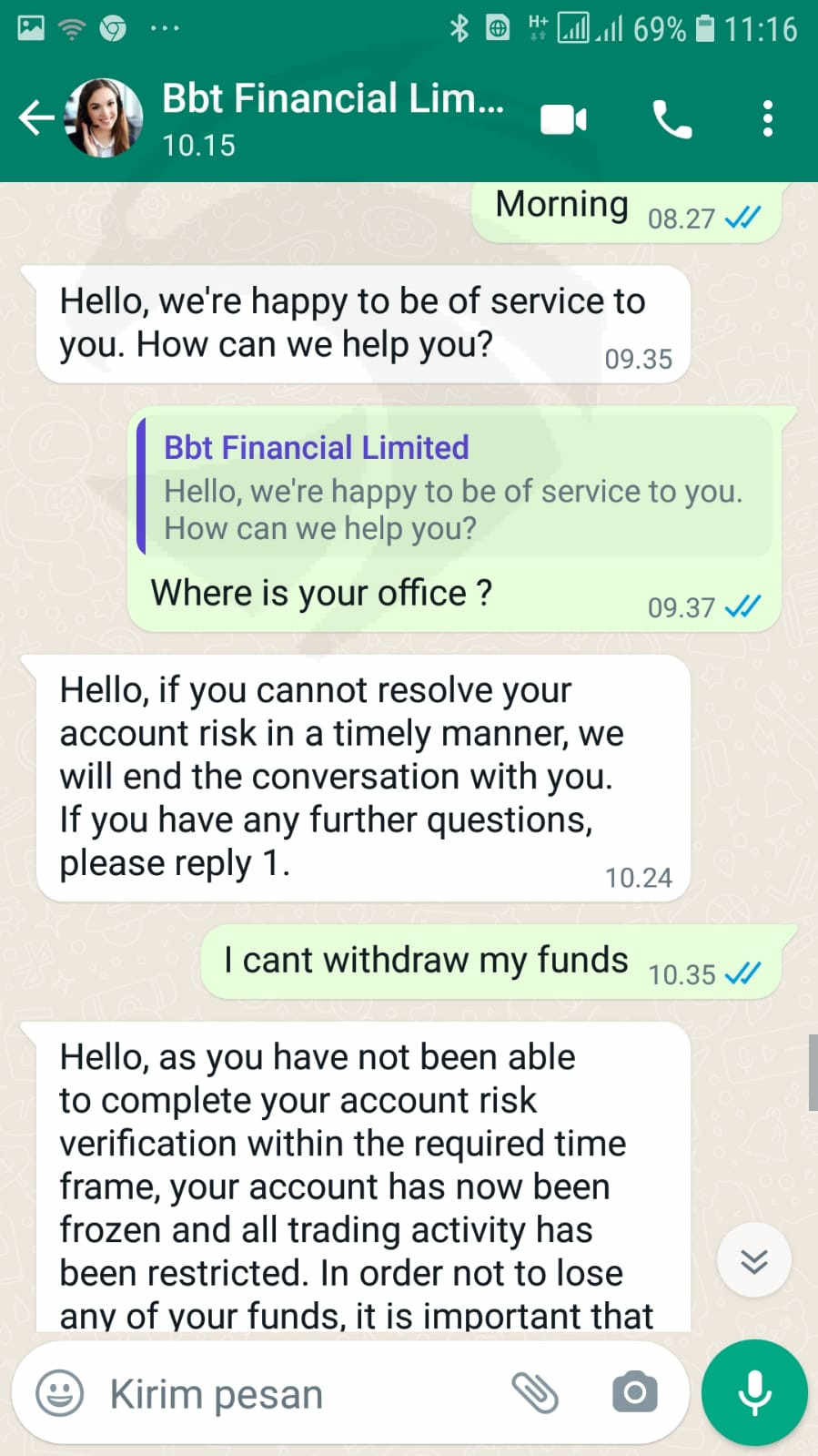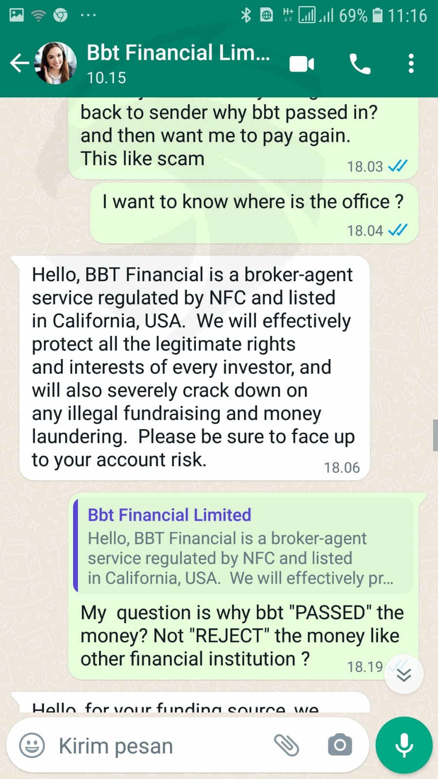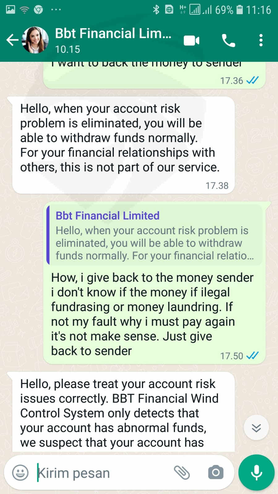第一个故事有人问我学习投资并将我引向这个网站交易商,然后我加入了,因为我非常信任她。她想帮助我投资外汇业务。她每天都教我。起初这笔钱相对较小,只有 200 美元加密货币,然后我可以成功提取 100 美元。然后用更大的钱一次又一次地存款并提取750美元,并成功提取。在我相信它不是骗局之后。我再次存款到 8626 美元,然后一直玩到盈利 30.000 美元左右。后来我和她同意为我们的基金爱存入,所以她向她姐姐借了1.6009美元,她存入我的账户,两天后我想提取7000美元左右的大钱被拒绝后,我打电话给服务并说1.6009 美元来自洗钱、非法筹款,如果这笔钱 24 小时内不是来自洗钱的钱或账户将被冻结并释放风险状态且没有其他解决方案可用,我必须再次支付 1.6009 美元。如果我没有做错任何事,你认为我必须支付巨额费用有意义吗?我要求提供现场代理、办公室、电话号码,但客户没有提供任何人支持所以现在我的帐户被冻结,无法取款.提防大钱不能提现!在我的情况下,他们使用洗钱作为原因!注意:该网站说它自 2015-2022 年以来一直在营业,但该网站的仍然存在 2 个月大,请看我的屏幕截图。 -> https://bbtforex.com
