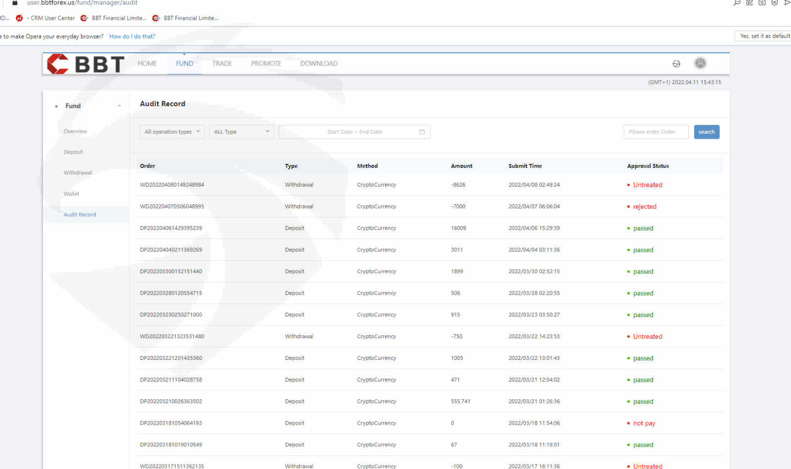 At first the money is relativelynya small only $200 with cryptocurreny and then i can withdraw it succesfully 100$. Then deposit againand again with bigger money and withdraw 750$ and it sucesfully withdrawed. After i believe it not scam. i deposit again up to 8626$ and played it until profit around 30.000$. Later i and she agree to deposit for our fund love, so she borrow from her sister and she deposit to my account 1.6009$, two days later after my i want to withdraw big money around 7000$ and rejected, i call the service and say 1.6009$ was from money laundry, ilegal fundraising and i must pay again 1.6009$ if that money not from money laundry for 24 hours or account will be frozen and to release risk status and no other solution available. Do you think it make sense i must pay for huge ammount if i'm not doing anything wrong?i ask for live agent, office, phone number and no one given by the customer supportSo now my account frozen and can't withdraw the money. Beware if big money you can't withdraw it ! In my case they use money laundry as the reason!Note: the site say it has been business since 2015-2022 but the still age of site still 2 month old, look at my screenshoot. -> https://bbtforex.com