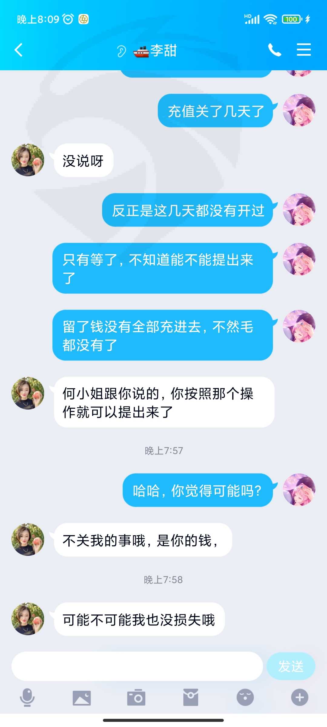 你们是不是通过一个叫甜的女孩子,带着去跟老刘炒股,然后又去做黄金的,如果是那就报警,估计是一伙的,林顿简讯的那个甜的很正经的女孩有一个电话号码,那个号码的主人认识甜的很正经