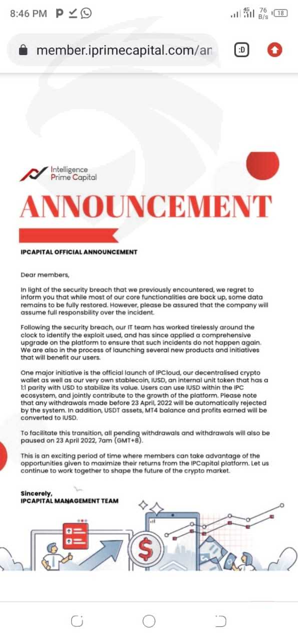 IPC是黑公司。请在他们上传我们的资金时同意我们的介入请求。他们使用下面列出的钱包地址将系统中的所有资金都拿走了。参考附图。 TUEgUZh24tA48EXiAQjA6Qf6rSS7bJKQ6g TRoEvpi67ZA5F1u7bGcAe1v37h3UYdx9Ee TAzsQ9Gx8eqFNFSKbeXrbi45CuVPHzA8wr TSM1puzhnNyYPjomRP1pUeWd5PDv7gEmPg TXWmdMZkLA45WPiKqTMeLvcHPeZSj1npdp TXHW7VX2TGLdL92XXzPqavhQtwewpSGK8S TGGUCScTw2VrD7RP7pxQwm5FmRwh5SmJps