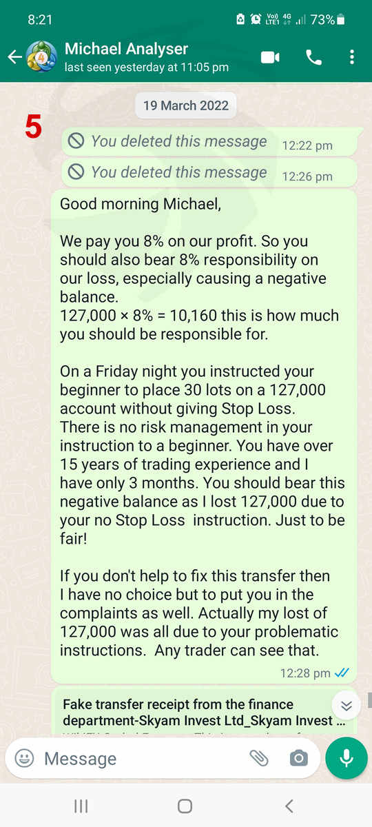 Photo 1, 1a: Instruction given by Michael, the analyst on Friday night 25 Feb 2022Photo 1a: Right after the spike, I showed Michael the evidence of manipulation by comparing the charts of Skyam Invest with charts from 2 other platforms that did not have the spike. Under the spike there was no big volume that supported the fluctuation of the market. These are evidences of manipulation and scams.Photo 2: Michael kept silent since 27 Feb 2022Photo 3: Shows Michael knew what had happenedPhoto 4: "...if you want to withdraw money you need to return the money first..." So this is the purpose to blow up my account to a negative -2749.50.Photo 5: Michael is responsible for: no stop loss given.Photo 6: The first time Michael blew up my account was on 18 Nov 2021.Photo 7 and 8: on 18 Nov 2021, Michael’s instructions also had no stop lossPhoto 9: Who would dare to follow the instructions of this analyst to trade?To sum up, Michael, the 15 year analyst does not have risk management. He is the person who gives customers instructions to win and to lose all. These scams were all plotted! He would take 8% of the profit but not pay 8% of your loss. The server manipulation could not be successful if there is no participation of the analyst.Skyam Invest must compensate me 127,000 USD for the unfair MT4 server manipulation with the accomplice of the analyst on 25 Feb 2022.