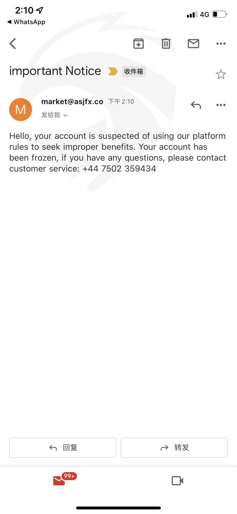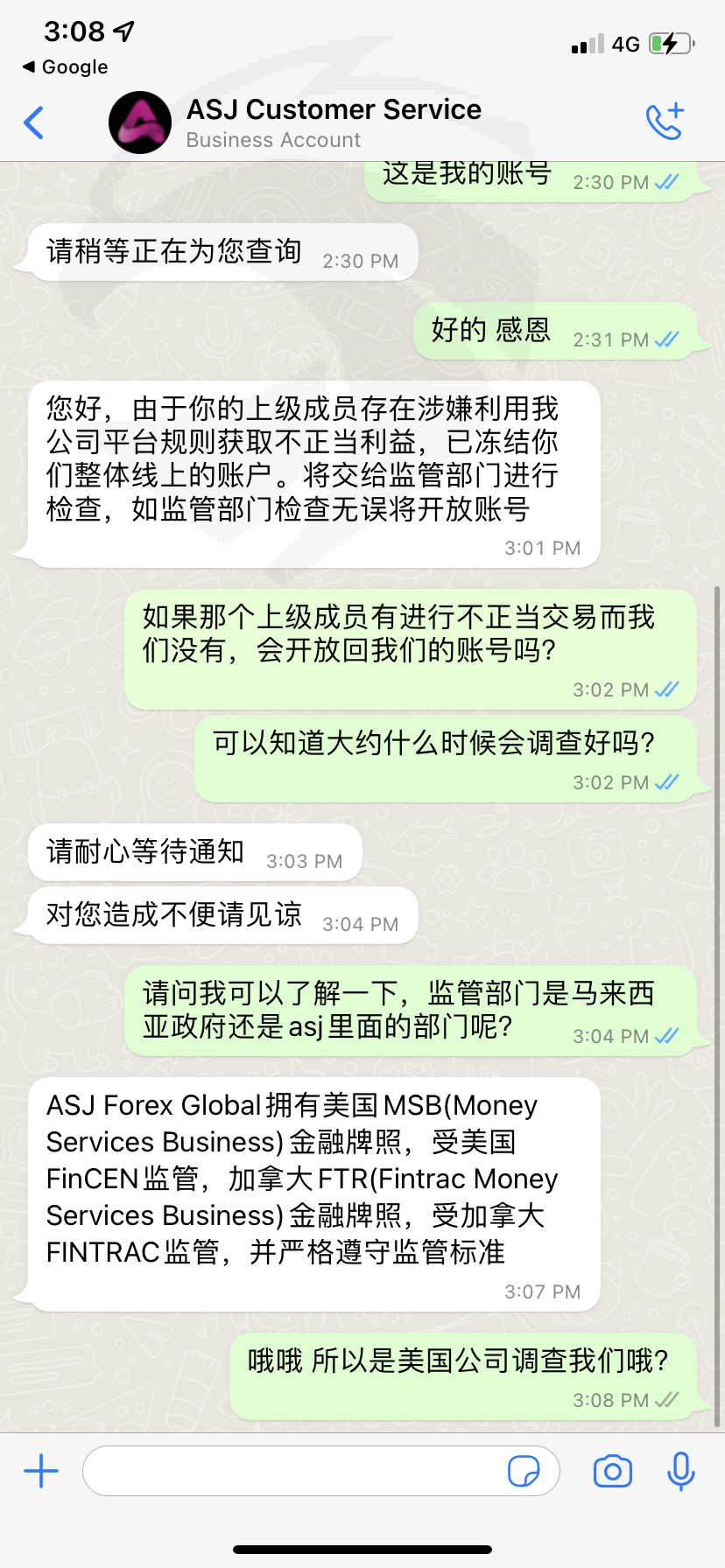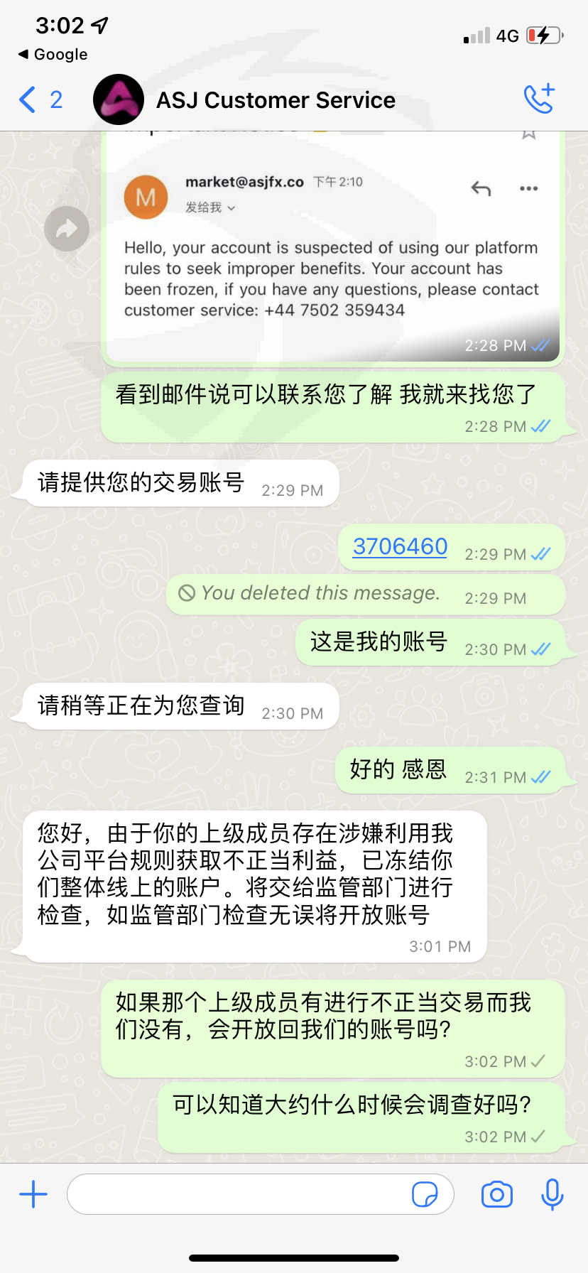 ASJ 这个公司突然在4/5/2022暂停了我的账号,使我不能交易不能登录ASJ账号了,里面的资金也因此被冻结不能出金,这很不寻常..它发来的邮件是说我的账号有用来谋取不正当的交易,事实是没有,我都是在正常交易,而且不止我一个遇到这个状况,连通我的下线我的上线通通都被封锁了,询问客服给我的理由是“您好,由于你的上级成员存在涉嫌利用我公司平台规则获取不正当利益,已冻结你们整体线上的账户。将交给监管部门进行检查,如监管部门检查无误将开放账号” 可是却给不出一个确切的期限什么时候会查好,而且上级成员出问题为什么要连通无辜的我们都要被封锁呢我不明白,请帮忙申诉我的账号被冻结的问题…我的账号是3706460