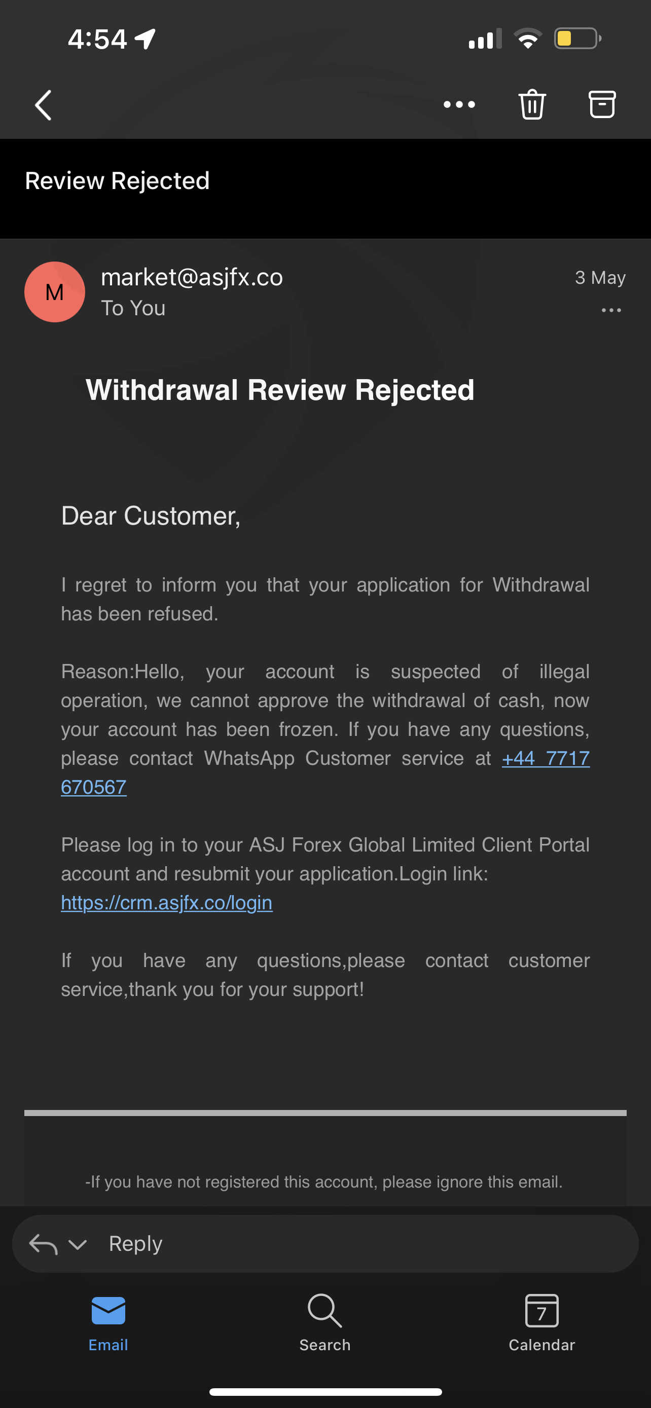 2022年5月4日,我的ASJ帐户在没有提前通知的情况下突然被禁用。我无法取款,申请被拒绝。处理我的请求时,客服没有耐心。账号被禁用的第二天,才收到邮件说我的账号涉嫌利用我们的平台规则谋取不正当利益。我在交易时使用ASJ平台进行正常的外汇交易,中间没有其他不正当利益。我怀疑平台想阻止我提取自己的钱。我有一些下线和上线曾经提过钱面临同样的情况,只有那些从未提过钱的新账户用户仍然活跃并且能够交易。