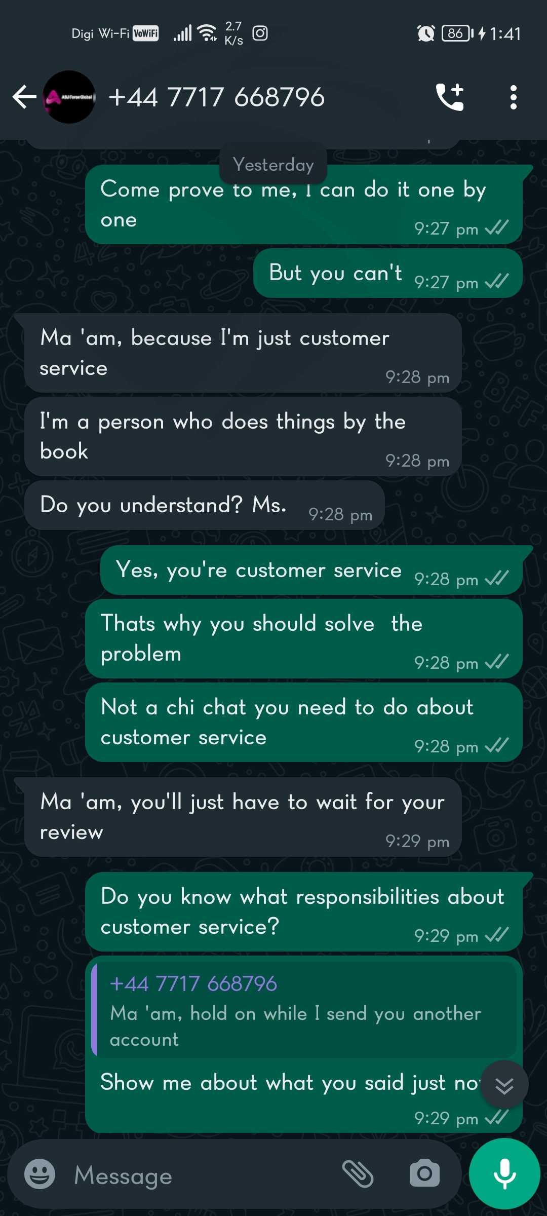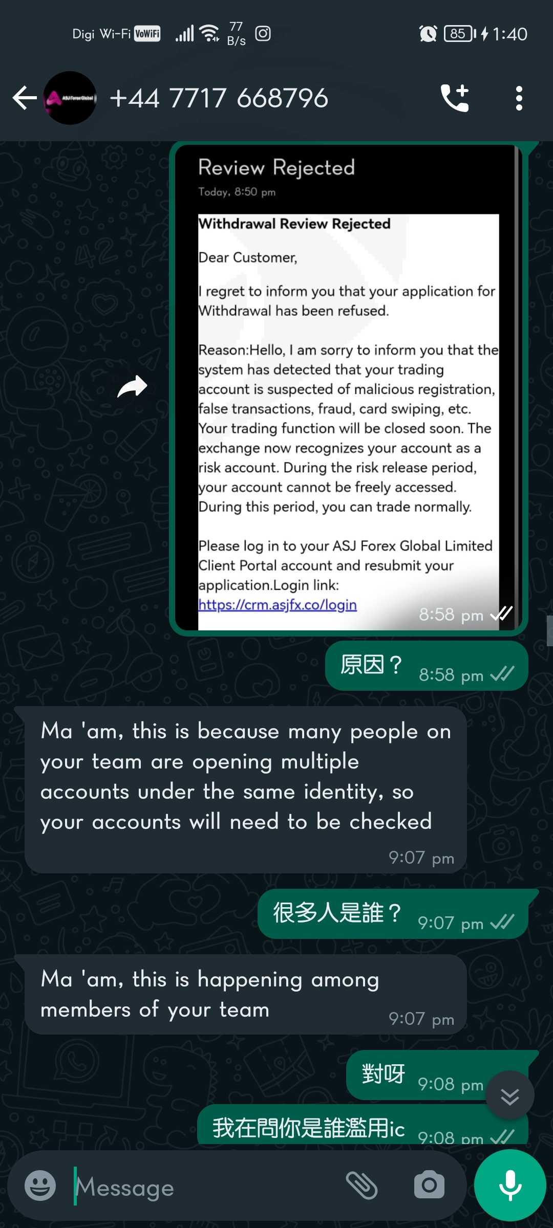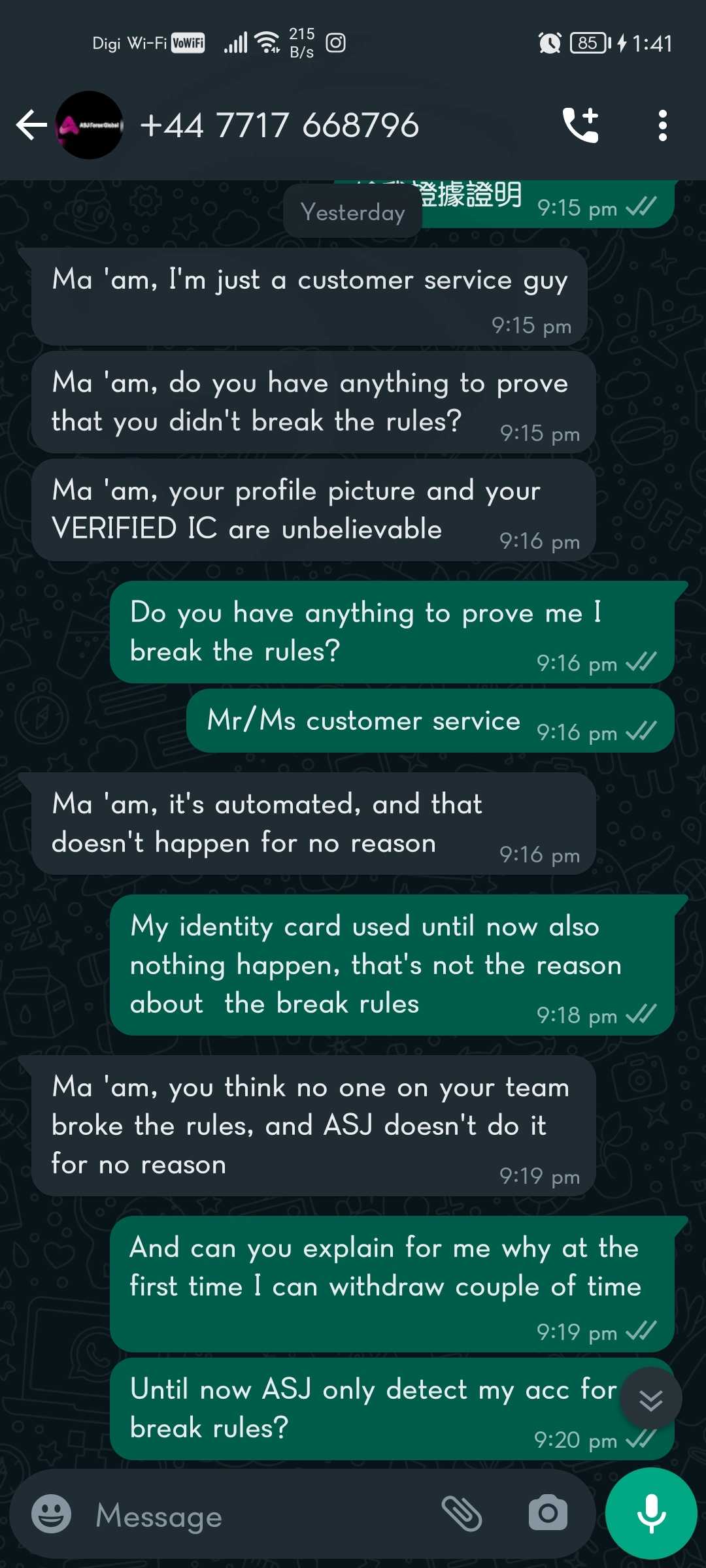 在我们的谈话中ms/Mr 客服说是Chang Yee Ling违反了asj规则,但他们无法向我证明