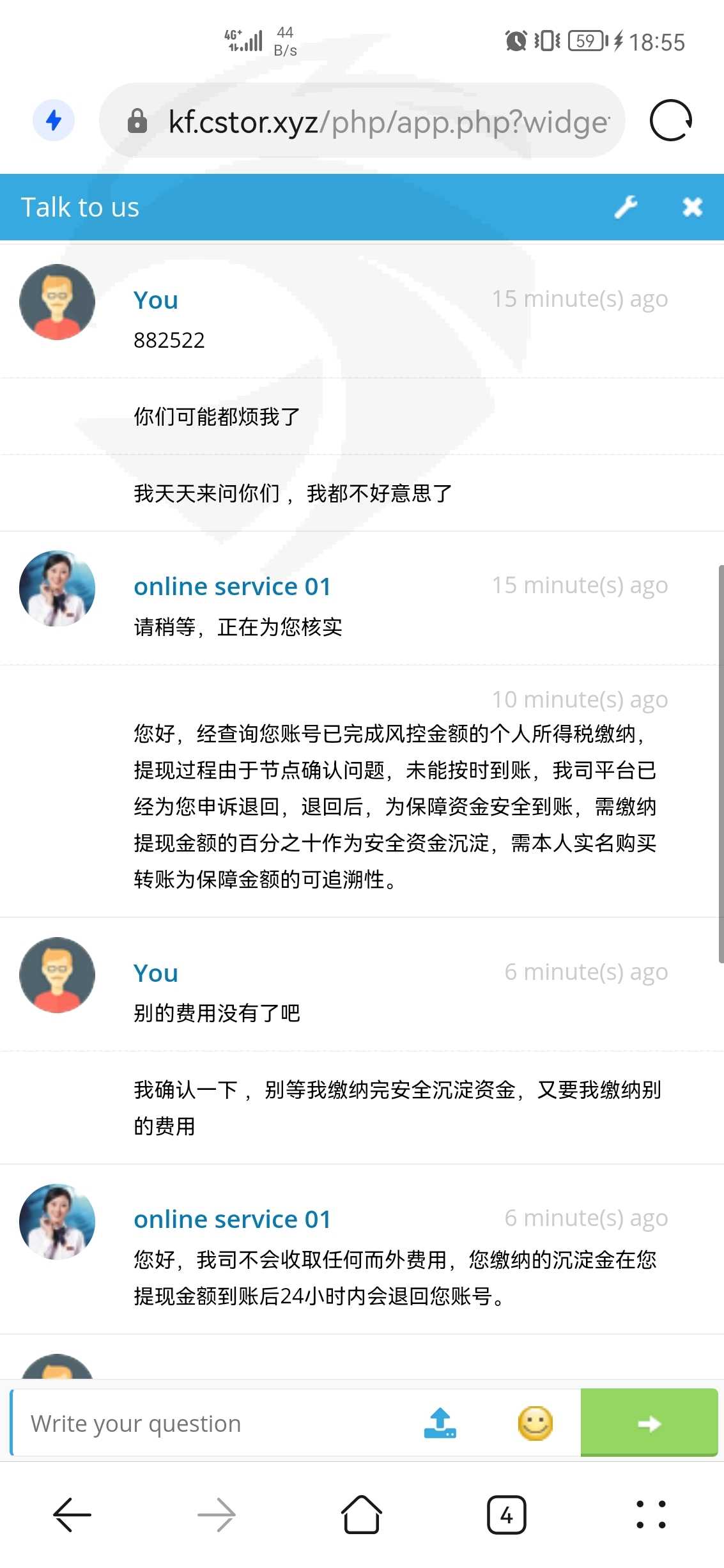 由于我的账号出金被风控了,客服说缴纳百分之二十五的个人所得税,要一次性全部提现!三天就能到收到转账,缴纳了安全沉淀资金后,客服说24小时就能到账,结果过了24小时,客服又说要等7到14天 才能收到转账 ,到现在一直没有收到资金到账!