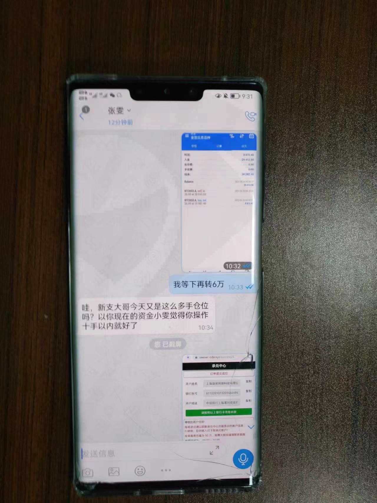 5月28日打电话推荐企业微信,加他们的企业公众号 穆夸可文化信息,助理张雯拉入散联社聊天群,6月初组建QQ群,推荐股票六国化工,他们通过散联社大讲堂讲课,定时上午9点20到10点半(董浩),下午2点到3点(刘振清),晚上7点到8点(董浩),8点到9点(刘振清);讲课中提到散户都是韭菜被机构收割,散户团结起来收割机构;然后提出和机构合作操作一支股票,称为金股3号(神州信息),称对外合作机构是混沌投资(葛卫东),张建平投资集团,南方基金散联社负责建仓,张建平和葛卫东负责拉升,南方基金接盘,特别突出数字货币概念,说是国家战略;大家纷纷报名参加投资计划,我预定了100万的额度;然后为了保密,他们给了他们专用的通讯工具,Ant Messenger安装包,大家安装后,再成立群;6月中旬开始分批建仓,按照出资额10%的比例建仓,建仓过程中,有发现大单买进,董浩通过南方基金的关系发现是外资在抢筹,并且说外资是加了4倍的杠杆在买进,只要打压股票下降20%,外资就会爆仓,需要8个亿的砸盘资金,需要散联社承担,刘振清就到处筹集这8个亿资金,处处碰壁,这时候董浩就提出操作比特币快速赚取这8个亿资金,刘振清刚开始不同意,但是随着金股三号计划的一再推迟,他最后没办法,6月27日开始带领散联社成员转战比特币市场,并称他们要和国家一致,只做空比特币,并称国家队很快也会参与进来做空比特币,到时赚钱的空间很大,有超过10倍的收益;给了Seener Tech Limited开户专员的二维码,大家纷纷加二维码下载MT5交易软件;我初始投了5万人民币,入金转账是山东鑫园贸易有限公司(承兑商),很快投资账户上就有7300多美金,跟着刘振清和董浩一天的操作,就赚了2000多美金;然后他们喝多人在群里晒收益,助理张雯和社长刘振清也劝说增加投资;后面陆续投入资金176万人民币;然后他们就通过后台突然大幅拉升比特币价格,使得很多账户爆仓,然后再让你追加投资,7月5日和7月6日连续大幅拉升两次,而我查了国际比特币交易价格没有这个波动,并且价格完全不一样
