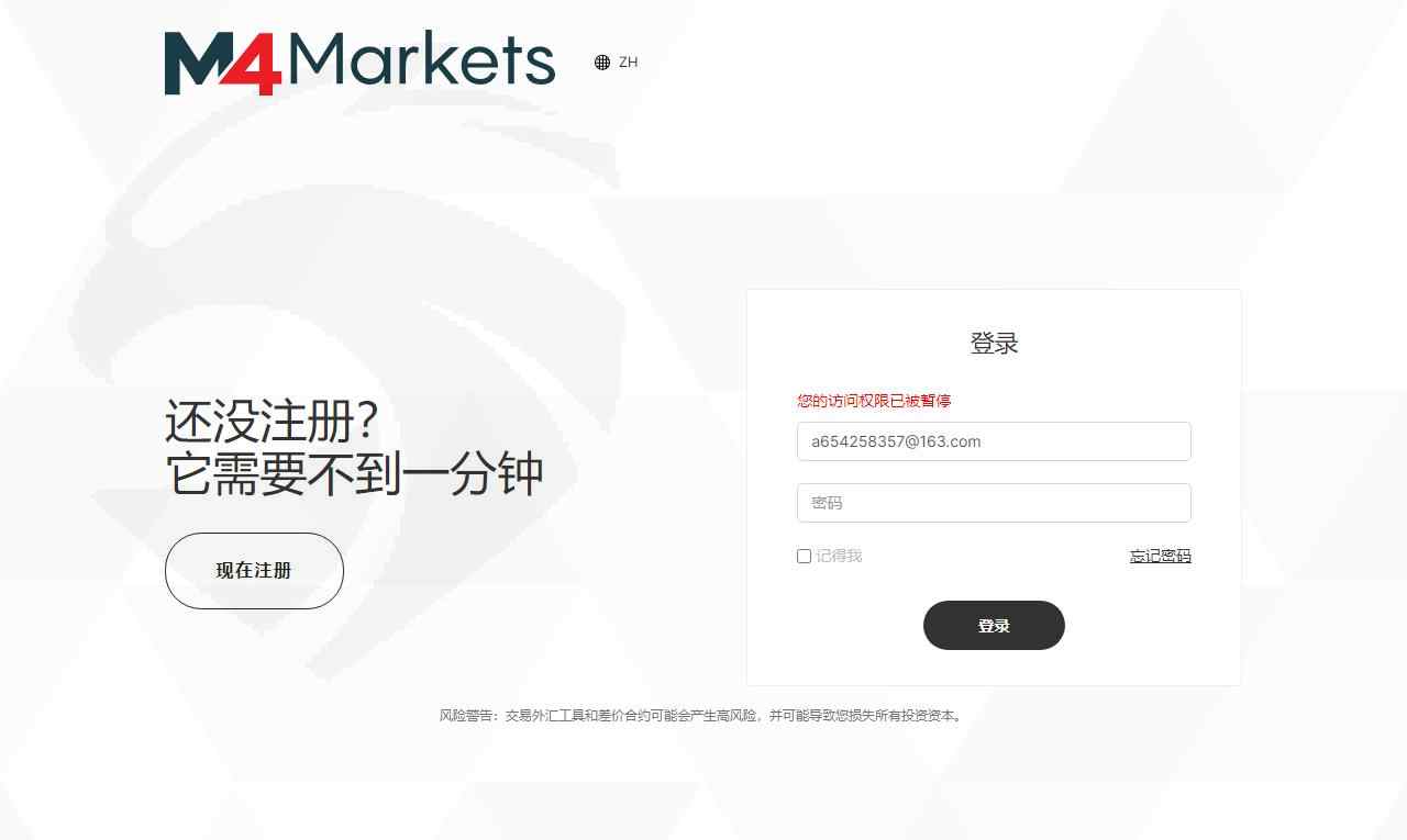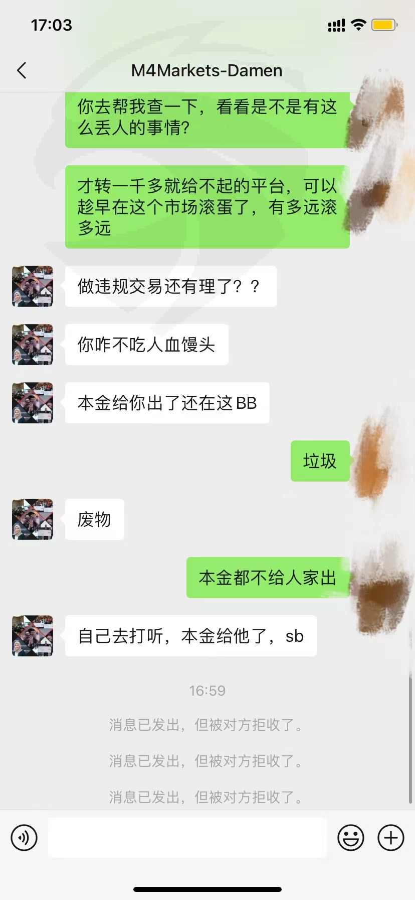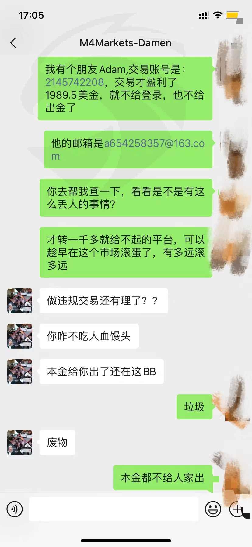 这是我在外汇市场交易以来,第一次遇到这么黑这么坑这么无赖这么没有实力的一家平台,我在M4market的MT4账号是2145740165,我的同名MT4账号是2145742208,在没有收到任何通知的情况下,M4market把本人的官网后台禁用了---禁止访问无权登录,把本人MT4的登录权限关闭了---导致无法登录。无可奈何之下只能另寻它法,于是叫我朋友在该公司注册了一个MT4账号并拥有了一个客户经理对接,结果遇到了毫无素质的客服,甚至毫不犹豫就把我给拉黑了。我在该公司的盈利总共只有1989.5美金,我的所有单子下单平仓时间都是正常的,并没有做过任何秒单或者别的违规单子,我以血的经历来告诫大家,这家黑平台绝对绝对不能做,就算客户经理跟你说开户入金有赠金百分之十,各种好话说尽像只那个啥一样,你都绝对不能入金交易。你想要它的百分之十赠金,但是它从始至终都只是想着你的本金,毫无职业道德毫无公平交易原则,如此平台非常寒人心,请大家一定要远离