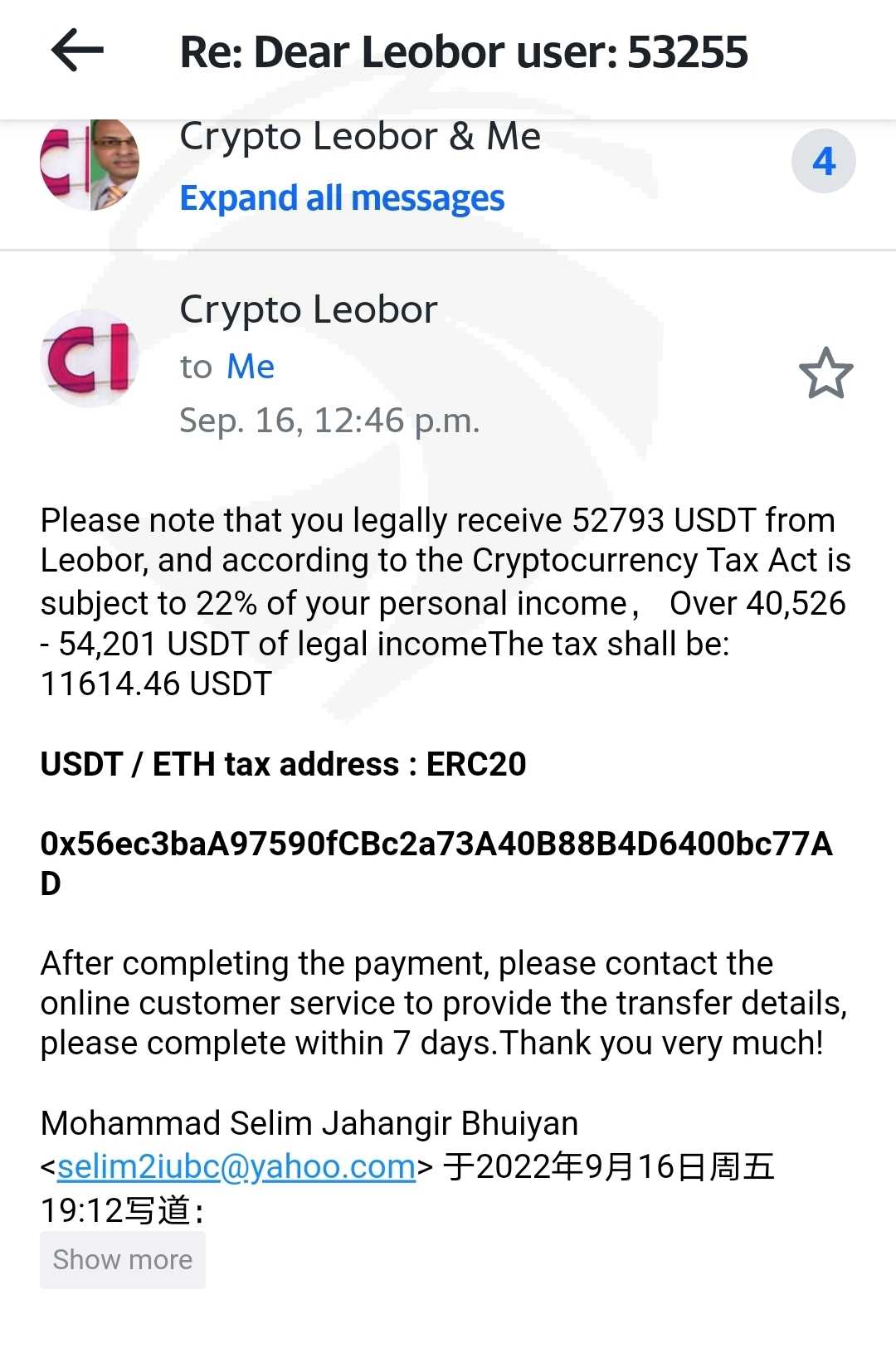 尊敬的先生,作为上述情况的受害者,我写了这封邮件。由于新冠疫情,我生意倒闭了,还从朋友和银行借了巨额贷款。我正在努力挺过去并想尽早还清贷款。我的一位朋友介绍他的朋友给我,我听她的并在她的指导下开始在线交易。刚开始的几天我的投资几乎翻了一番,她让我把钱取出来存入银行,过上正常的生活。她计划让我投资更多,去还清我的贷款。我听她的,相信她。所以她建议我向贷款10万美金。请注意,我只与进行的所有商业交易。当天她告诉我,我可以偿还贷款并保留我的利润来还清贷款。当我试着还贷款时,他们(Leobor)说我必须从 Leobor 账户以外的其他贷款中支付,否则我无法操作我的账户(提取任何资金)。我从一家利率非常高的贷款公司借了 15 天的钱,然后我向 Leobor偿还了10万美金的贷款。他们说现在我可以从我的帐户中提取资金。当我试图取出时,他们拒绝了,说我没有向国税局缴税。他们给我发了一个加密地址 {USDT / ETH 税务地址:ERC20; 0x56ec3baA97590fCBc2a73A4B88B4D6400bc7} 向国税局缴税。他们威胁说,如果我不缴税,国税局将在 7 天内逮捕我。我与国税局沟通后,国税局的人告诉我说这是一个骗局,并建议我不要付款。