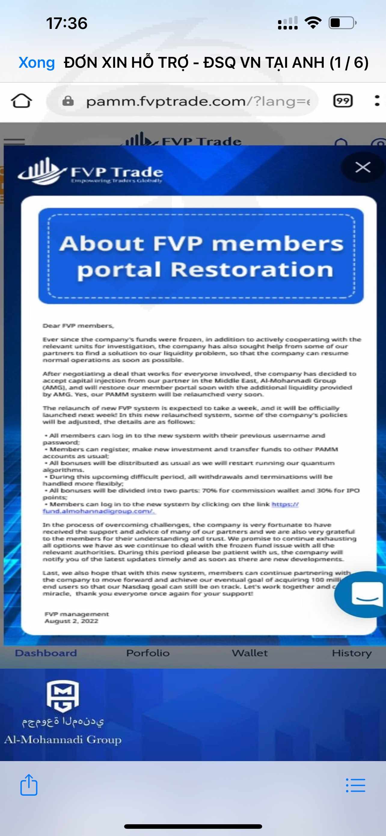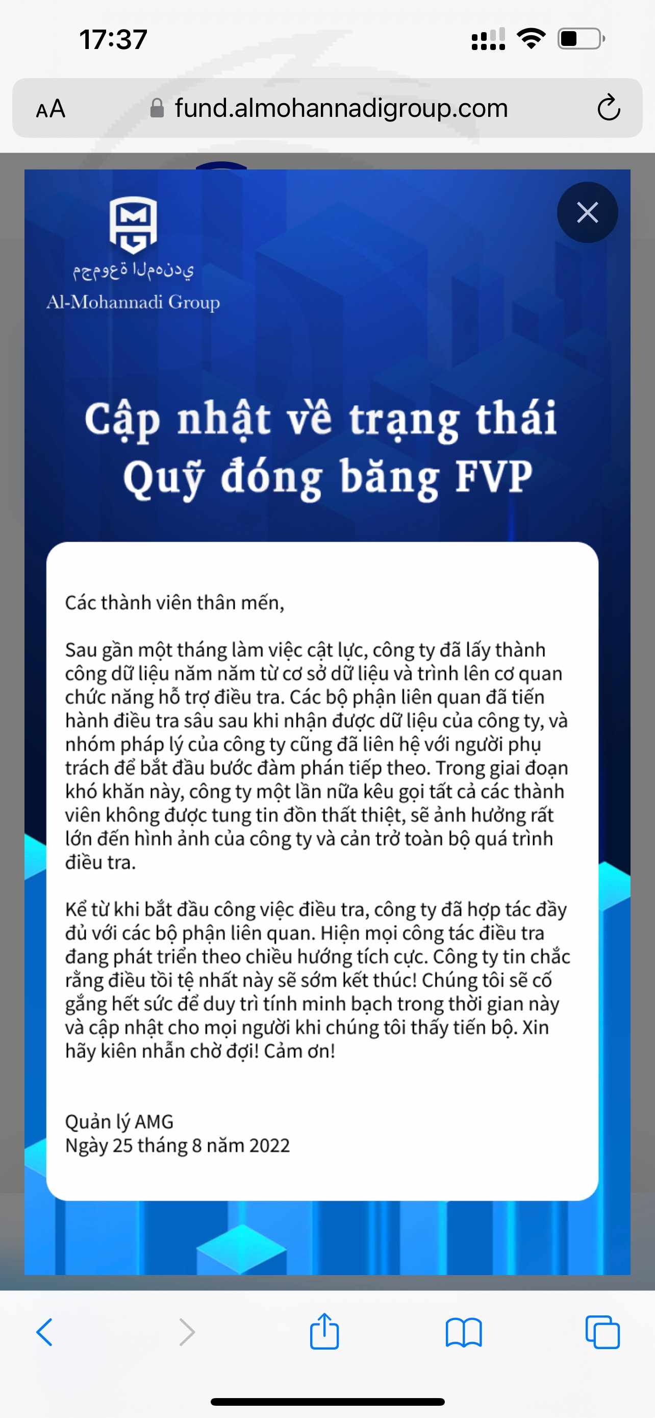 từ khi FVP thông báo tạm thời đóng băng tài khoản do bị thanh tra đến ngày 25/8/2022 chúng tôi chưa nhận được bất cứ thông báo nào của công ty FVP. và hiện tại chúng tôi cũng không rút được tiền. nên các nhà đầu tư của chúng tôi đã nộp đơn xin hỗ trợ của Tổng Lãnh sự quán Anh tại TP Hồ Chí Minh, việt Nam xin xác minh xem công ty FVP Trade có phải là công ty thật không hay là công ty ảo. nếu là thật thì chúng tôi muốn xin visa qua bên đó để gặp đại diện của công ty FVP Trade hiện tại các nhà đầu tư rất hoang mang. do những bạn dẫn về việt Nam đã trốn toàn bộ và không liên lạc được với ạ.