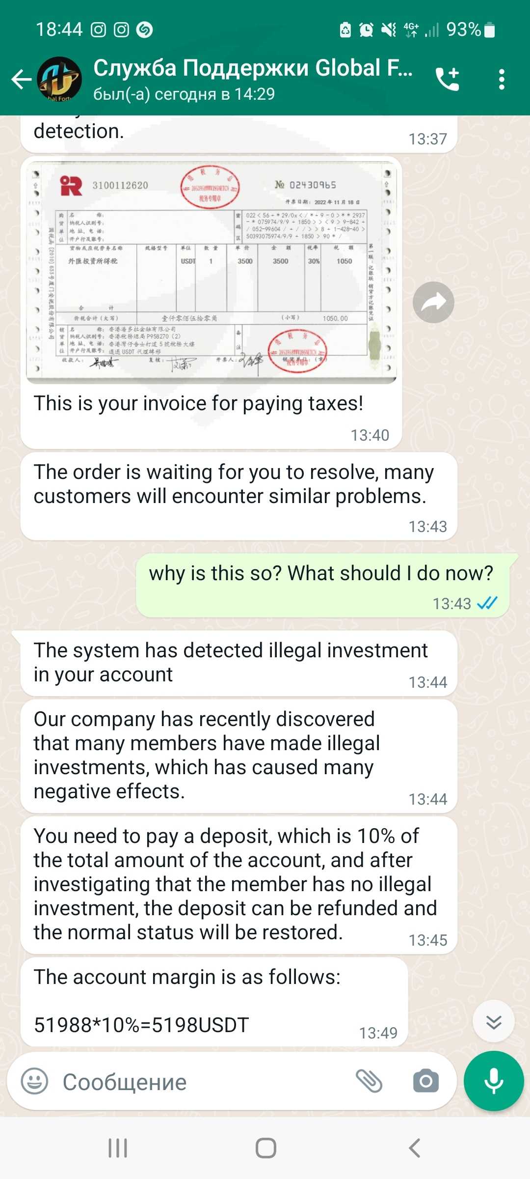 A girl from Tiktok wrote to me, then she asked me to switch to WhatsApp, and we continued to communicate there, then she said she was investing in some platform, and said I should also subscribe to it, I agreed to everything, and we invested together, a month later I already had $51998, and I wanted to withdraw $3,500, and the platform asked me to pay tax, I paid $1,050 tax, they didn't give me $3,500, they said illegal investments were found in my account, and I had to make a deposit of $5,198, I didn't have any money, I think this is a fraudulent platform and the deposit has not been made.