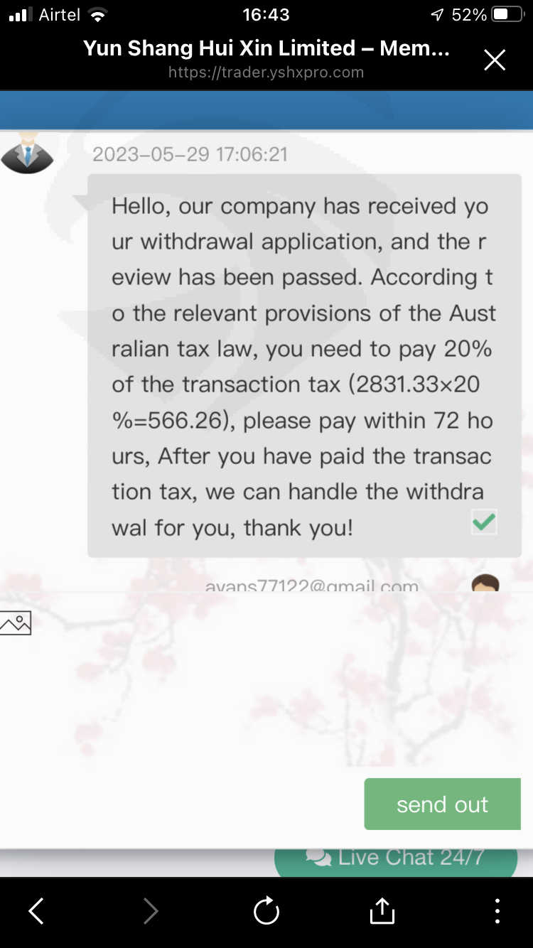 我的账户是 730007。旧账户是Titan markets limited的308134。这家公司和Yun Shang Hiu Xin limited合并了。我在mt5进行交易,一共投了1408 美元,税是566 美元。盈利后账户内有2831美元。在我填取款表格时,客户要求我存入 566美元的税款。存完税后客服说我一天内用非法软件交易多次盈利。他们一定有我所有的交易数据。现在客服要求我再存500 美元,说公司会审核我的交易和数据。他们显然是不想让我出金在骗我。现在他们往我账户里打了100美元作为补偿。现在账户里有2931美元,但是我的资产是2831美元。不让我出金,也不回消息。Link也不联系不上。