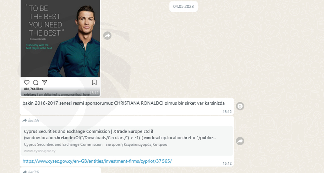 Kıbrıs Merkezli olan firma Ronaldo ve cysec lisanslarını kullanarak beni Türkiye'de yasal bir firmaymış gibi kandırarak 9.000 USD paramı 400 kaldıra. oranları ile aldılar şu an hiçbir muhatap ve yetkiliye ulaşamıyorum tamamen yapay zeka destekli olarak işlem yapılacağını ve hiçbir şekilde kaybım olmayacağını söylediler ama bütün paramı aldılar.