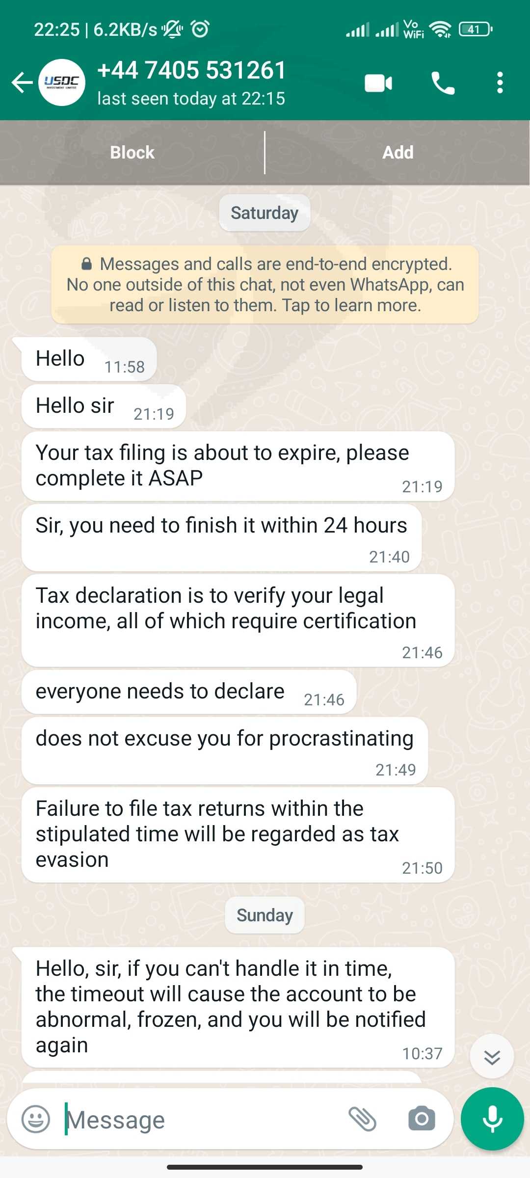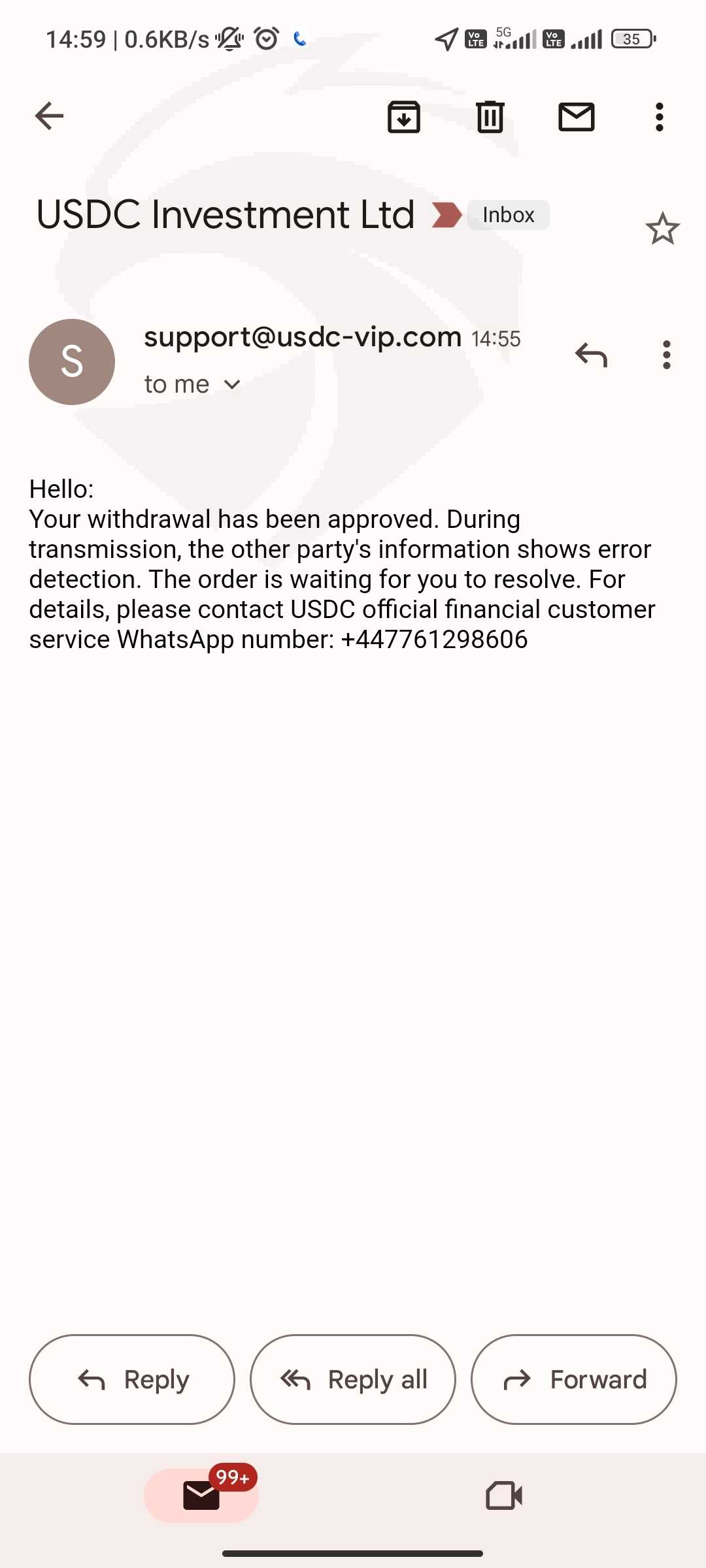 你好,我在 USDT Invest Ltd 上正常交易。当我申请提取利润时,平台要求我存入 20% 的税,我取了银行贷款并存入,现在又要存入 10% 。 请您查看一下并帮助我出金。 我有贷款、电子邮件和whats app聊天的所有证据。在此之前我已经出金两次50美元,都成功了。 附上客户服务部向我提供的公司注册号码,供您参考。
