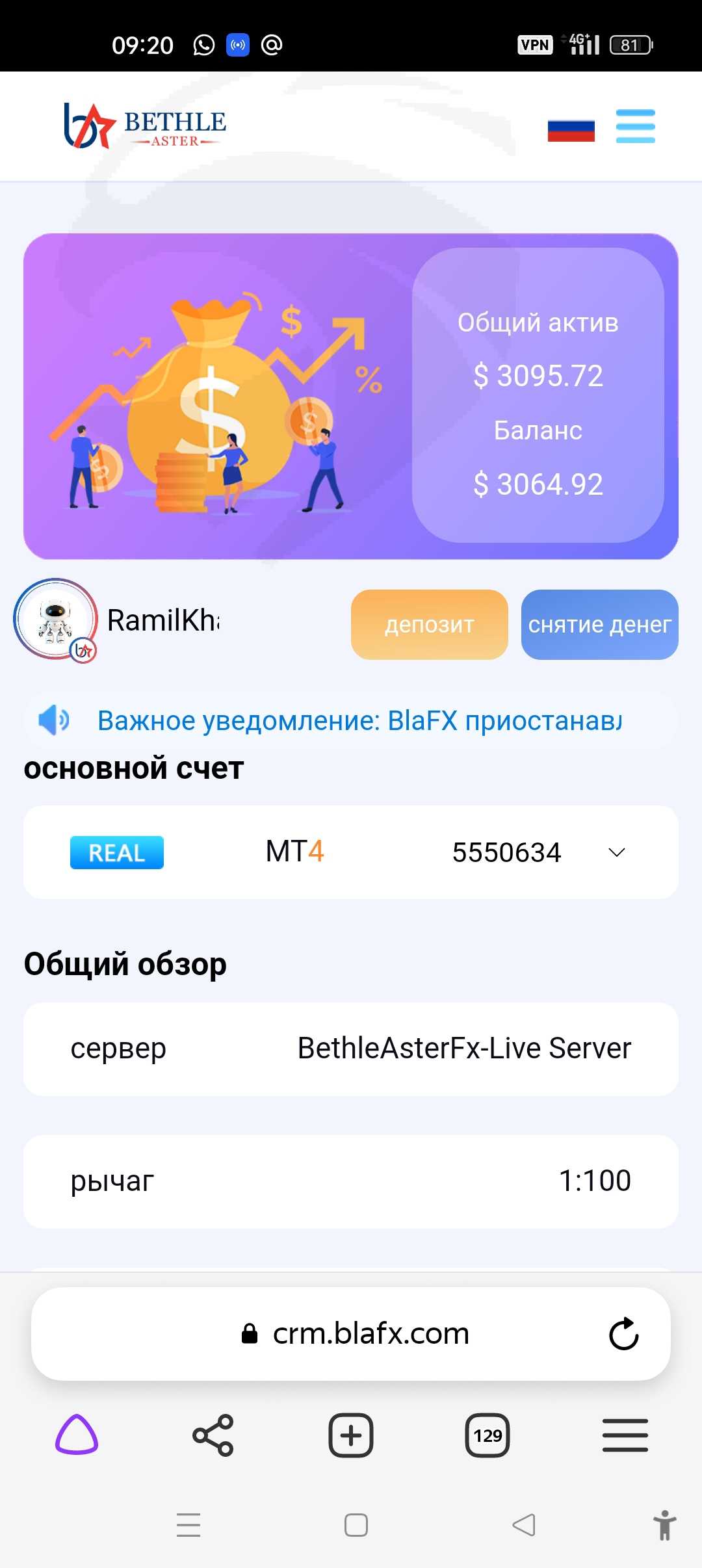 尊敬的 BlaFX 用户: 我们怀着诚挚的心情向您宣布一个重要决定:BlaFX 外汇经纪商已成功完成对香港公司 Celestial Cloud Dynamics(股票代码:HK06610)的收购。 作为我们未来发展的关键一步,我们正在转型专注于天云动力的运营并进行财务重组。 在此过程中,我们遗憾地通知您,为了顺利过渡和财务重组,我们被迫暂停BlaFX的运营。 自2023年8月22日起至2023年8月25日,我们将暂时停止MT4交易(同时您仍可以进行MT4以外的交易操作)。 在此期间,我们将进行必要的尽职调查和申报程序,以确保我们的过渡和重组顺利进行。 利得税缴纳和出金:根据相关法律规定,由于公司转型和财务重组,我们需要终止所有用户的账户。 此前,BlaFX 代表用户缴纳利得税。 但由于转型重组,我们将不再承担这笔费用。 用户现在需要缴纳 27% 的利得税。 一旦缴纳了该税款,用户将可以提取所有资金以保护自己的利益。 最终纳税截止日期和业务暂停:为了确保合规性,利得税纳税将从 2023 年 8 月 24 日中午 12:00(世界标准时间)开始,一直持续到 2023 年 8 月 25 日中午 12:00(世界标准时间) 。 为避免帐户被冻结,请务必在这段时间内完成付款。 本终止通知的倒计时持续24小时; 在此之后,所有业务运营将暂停。 请务必通知您的朋友和家人。