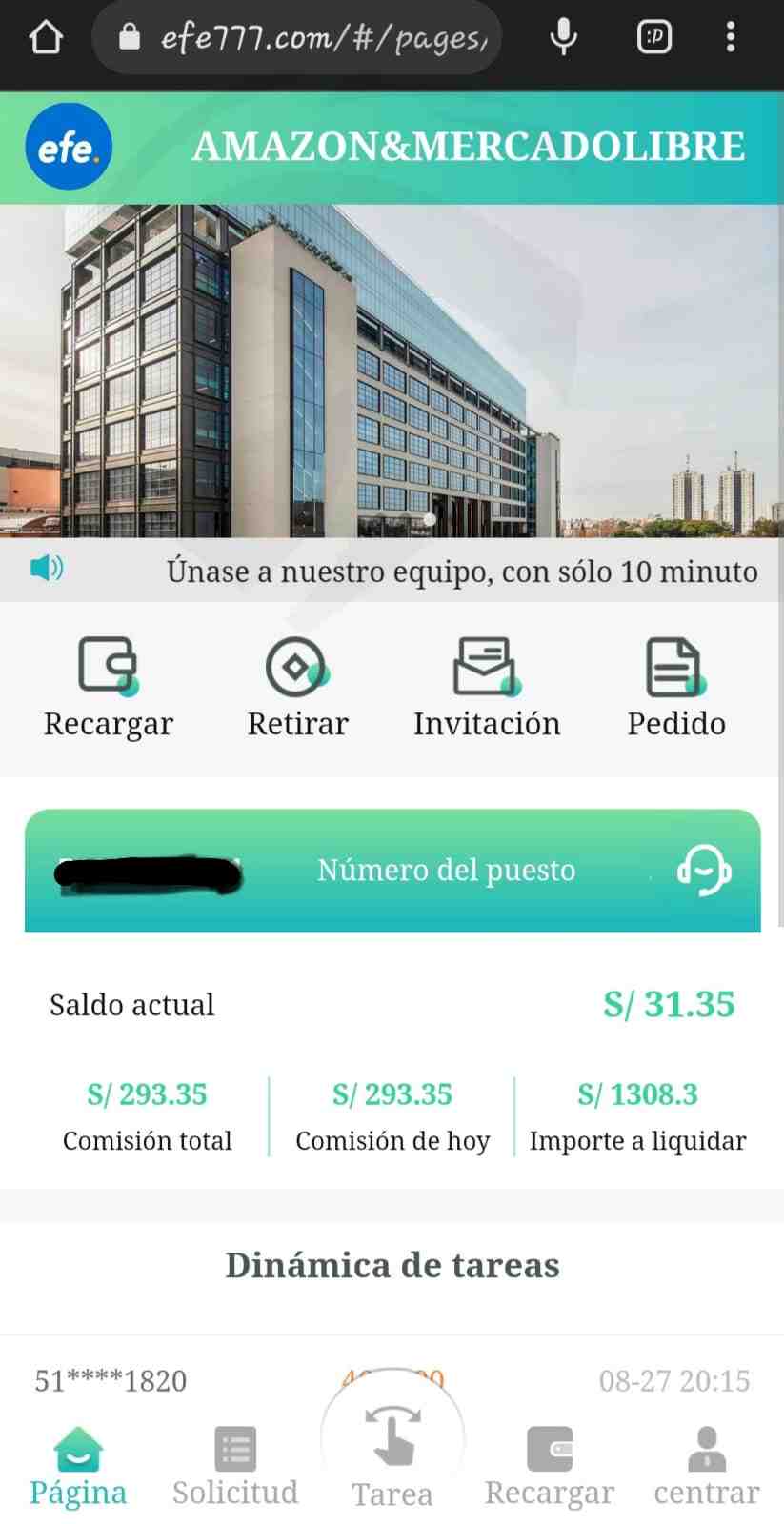 今天不幸的是,我被一家名为 EFE-Mall 的公司骗了,该公司据称在秘鲁利马运营。显然一切都很顺利,我开始用 12 索尔激活账户,我完成的每项任务他们都会存入我的资金,后来他们给我分配了更多的任务,他们希望我存入更多的资金,我就这么做了,直到他们要求我存入最高的金额。差不多1400索尔的数字,但我没有存入,因为很多,现在他们不想存入收益,因为他们说我必须完成委托的任务,即1400索尔。我最后一次存款是 390 索尔以及 100、50、26、12 和 10 索尔。总共存入 588 索尔。我只想拿回我的钱。