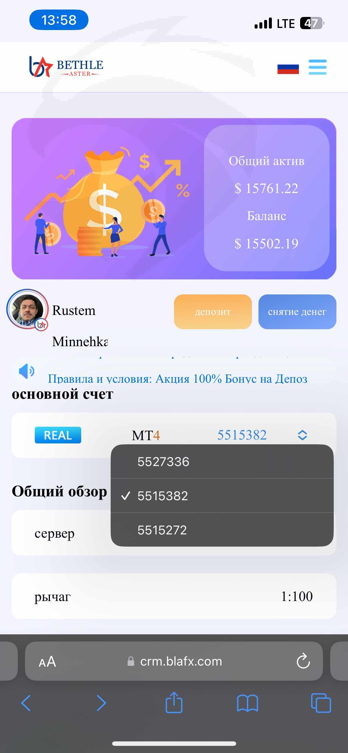 обработки) со счета. Сумма моего депозита 15761$ прикладываю скриншоты с аккаунта Blafx.com