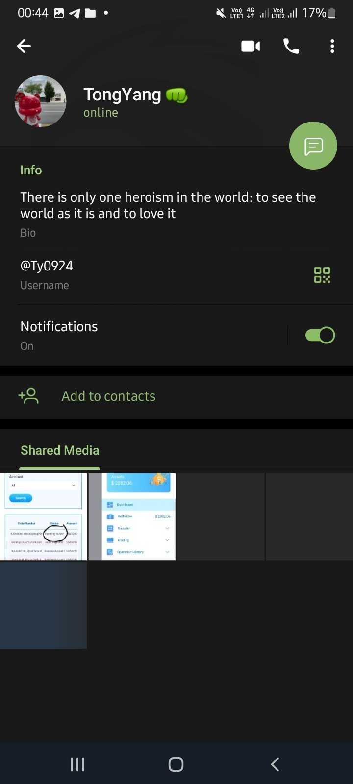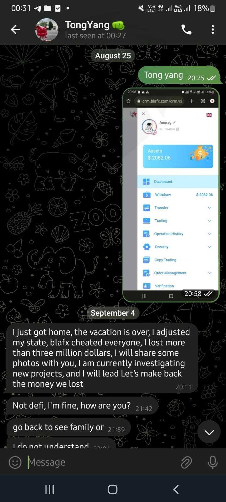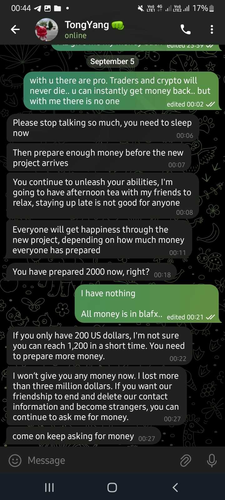 yesterday on 4 September that girl came online my team leader. tong yang. she replied my message of 25 august ..then she says. I won't give you a dollar. add more money for next project and we will recover. she said false things like she lost millions dollars she lost car house etc lies to convince that she was not part of that fraud. I have screenshots of everything. she forced me yesterday that add money or I shall delete our message chat in tele. I have her pic too