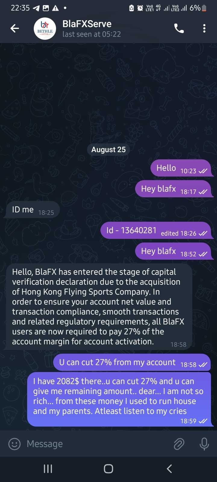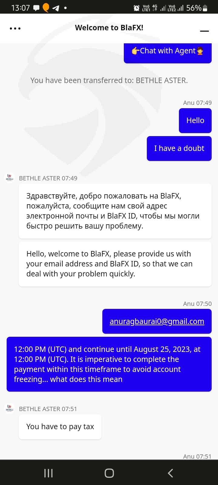 我们无法出金。 Bethle aster 这个外汇公司冻结了我们的账户,不允许我们出金。 8 月 25 日,他们在网站和群里发布了 blafx 即将关闭的通知。 需要缴纳 27% 的税款,然后我们可以恢复账户。 有些人付了钱,他们也不解封。 然后他们关闭了客户支持通道,也联系不到了。 我在CFTC网站和SEC网站上对bethle aster进行了投诉。 昨天9月4日之前的组长上线了。 她叫童阳。她回复了我8月25日的消息..然后她说。 我不会给你一分钱。 如果再入金,我们就会恢复你的账户。 她说了一些假话,比如她损失了数百万美元、失去了汽车和房房子等,以说明她没有参与欺诈。 我有所有内容的截图。 她昨天强迫我付钱,否则就删除我们的聊天消息。 我也有她的照片。