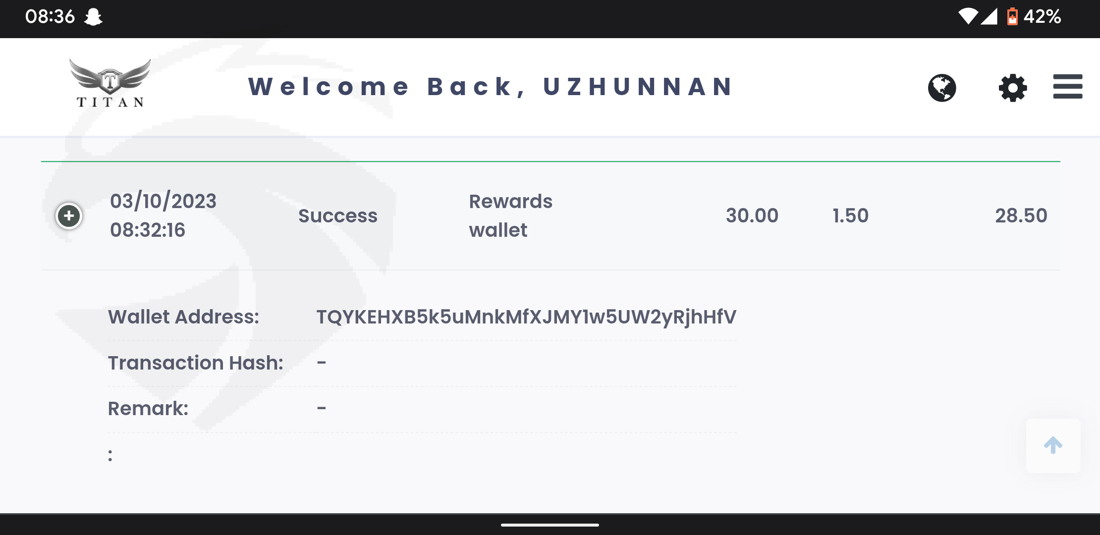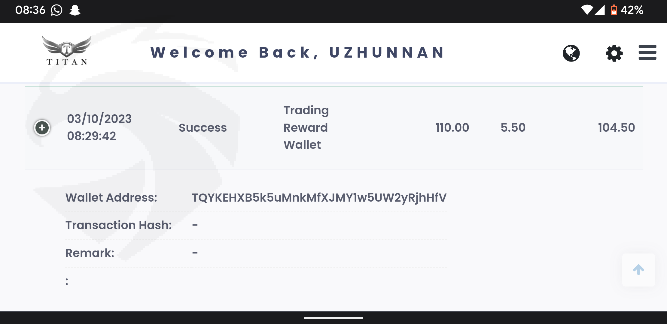 I am a member trading in Titan Capital Market. I had a total of 1840 USD in my account where it was 1700, 110, and 30 USD in trading wallet, trading reward wallet and reward wallet respectively. I requested for re entry principle where we could withdraw the profit and the capital amount goes back for trading. I only requested re entry principle and gave my binance wallet address but money including my capital was withdrawn from three different wallets to a single wallet address that I have no knowledge of. I tried contacting my higher ups for help and they confirmed that it was not from my side. I only am in possession of the transaction code and I did not share it with anyone. When I complained in the website's help and support, they keep telling me that the fund is already transferred and that it cannot be undone. How does that work when I only tried withdrawing my profit and not only did I not receive it, I lost my capital with it too. You have to understand that ALL THE FUNDS were transferred to ONE SINGLE WALLET ADDRESS. I addressed in the website's help and support that I will have to take legal actions but they aren't ready to retrieve my fund back to me.