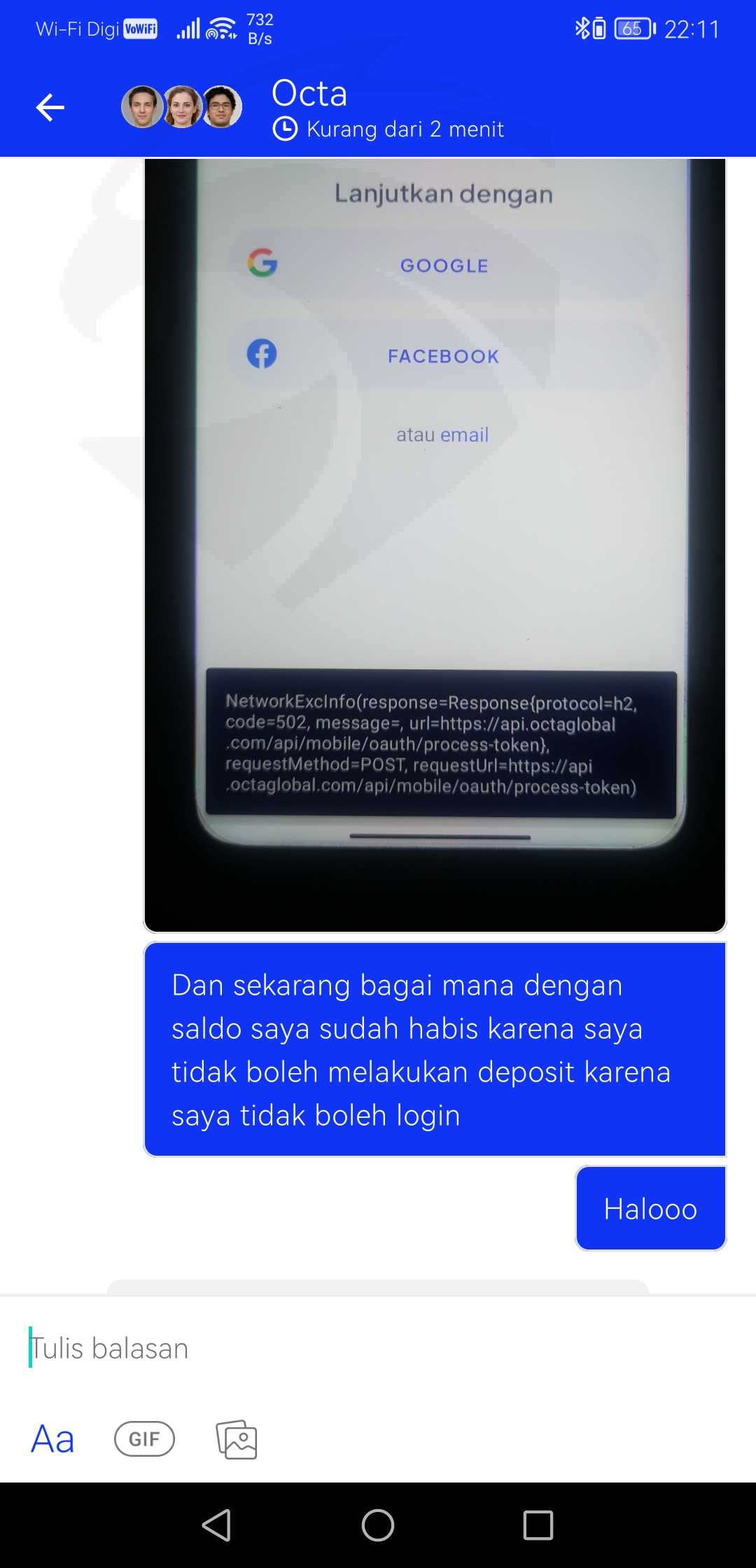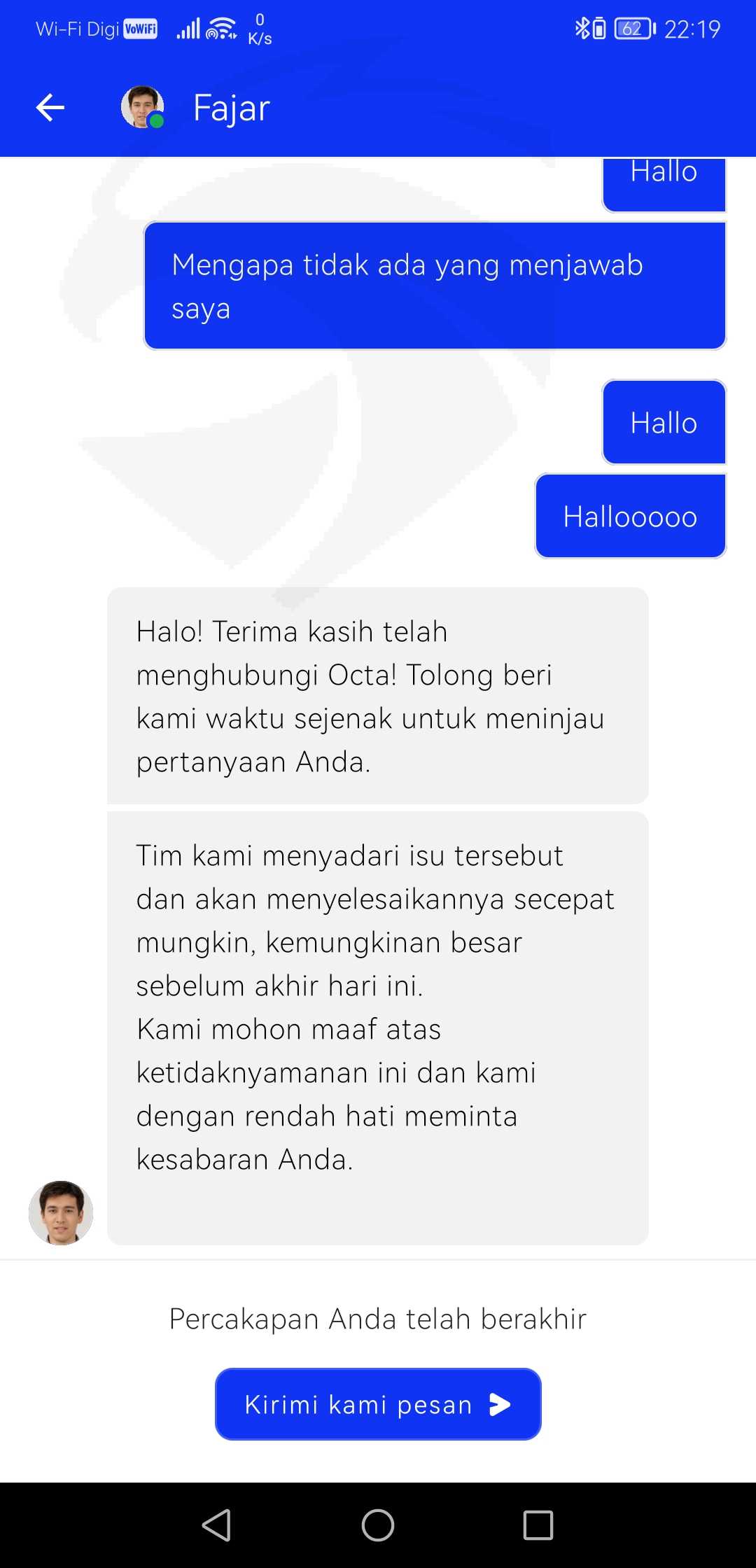 saya sudah berulang kali masuk ke live chat