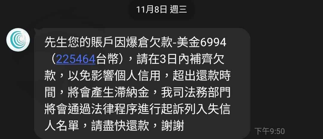 等到爆倉的第三天,又留了一段文字,讓我感覺是在恐嚇,對方公司既然說全額賠款,應自動將款項給予,而不是等客戶自己先歸還爆倉款,才給予補償。