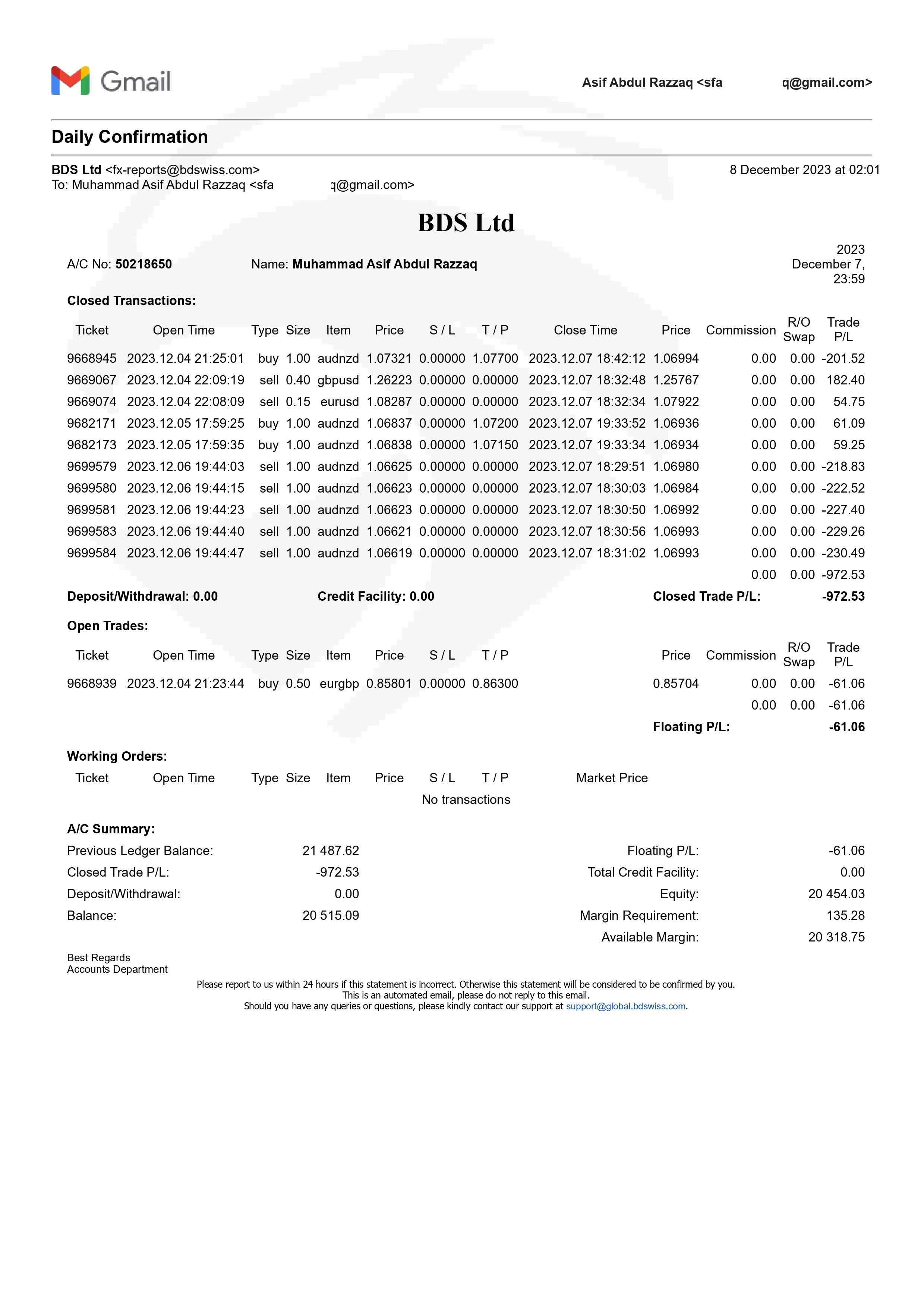 我在BDSwiss遇到严重问题。 我在BDSwiss 进行交易,一切都很顺利。 突然,当我要求出利润时,BD Swiss 从我的 MT4 账户中扣除了我所有利润,并向我发送了账户停户通知。 他们从我的交易账户中扣除17492 美元,还终止我的帐户,这些都难以接受。要求将已扣除的入金和利润退回。