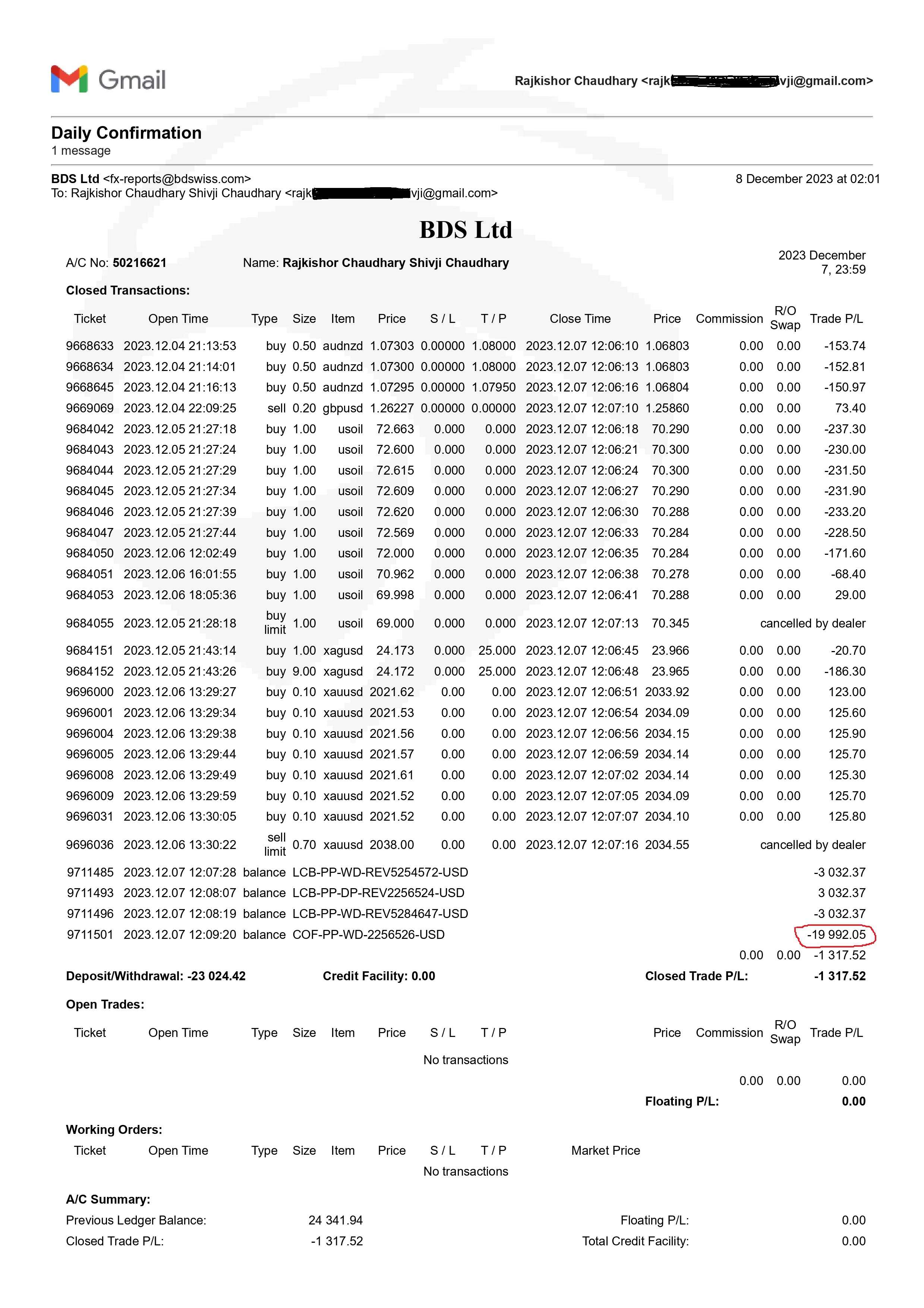 当我请求出金时,BD Swiss不仅拒绝,还删除我的余额,联系他们也没有回应。