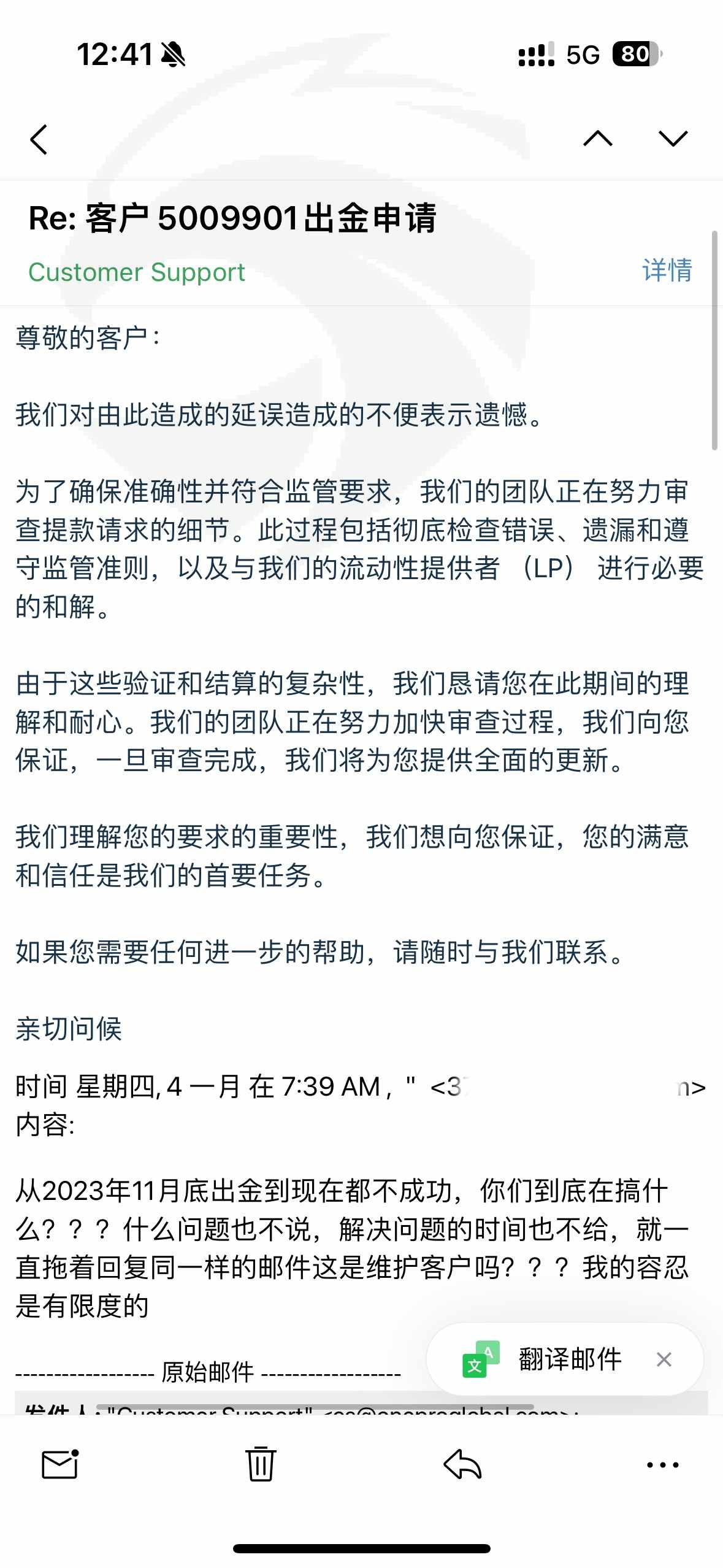 在2023年11月30日在onepro盈利申请出金至今仍未成功。平台一直无论是发邮件回复都是重复的“审核我的订单”这样的字眼就是避而不答。(我的交易订单没有问题,没有短于3分钟,也没有快进快出,也没有借助别的软件做单,纯手工做。)