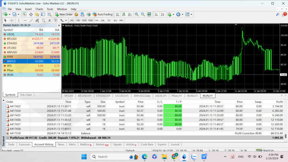 MT4 của tôi là 5102473. Ngày 13/1/2024 tôi có vào lệnh mã IRUNI và đạt mức lợi nhuận là 88,012.49 USD, nhưng đến ngày 14/1/2024 thì sàn đã tự động trừ toàn bộ số lợi nhuận đã đạt được của tôi ra khỏi tài khoản. Soho Markets gửi email giải thích là do lỗi giá vào ngày 13/1/2024. Nhưng thực tế giá của mã IRUNI đã luôn biến động tăng giảm như vậy trong suốt 2 tháng nay rồi. Tôi đã đề nghị sàn trả lại tiền cho tôi, nhưng không nhận được phản hồi, người phụ trách tài khoản thì cũng không liên lạc được. Tôi đã yêu cầu sàn liên lạc nhưng cũng không có ai liên lạc với tôi cả. Tôi đề nghị Soho Markets trả lại lợi nhuận cho tôi.
