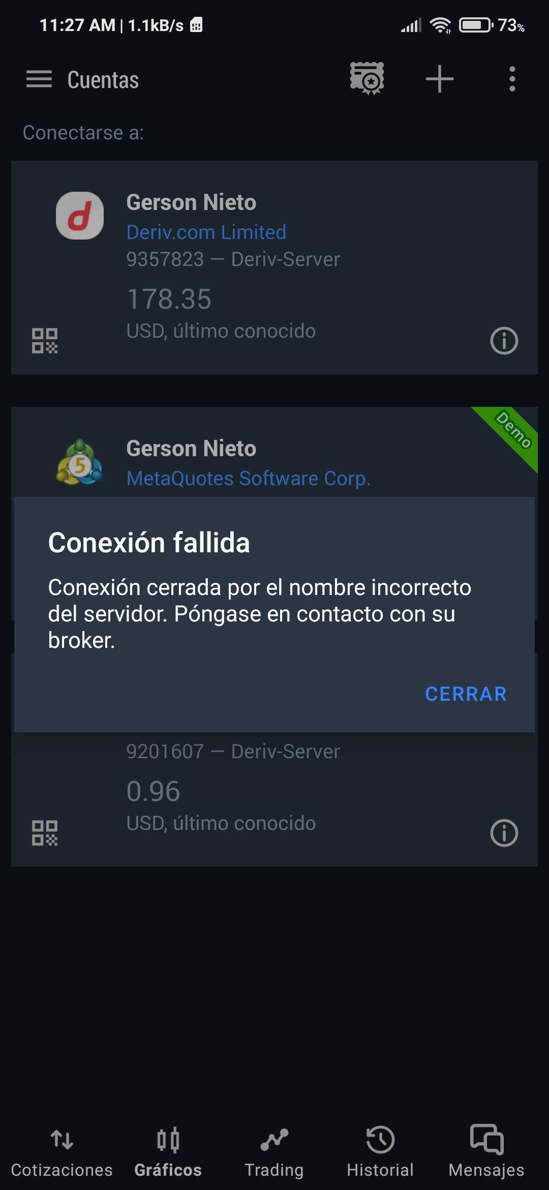 estaba haciendo operaciones y de repente me saco de la cuenta y no puedo acceder por error de nombre del servidor