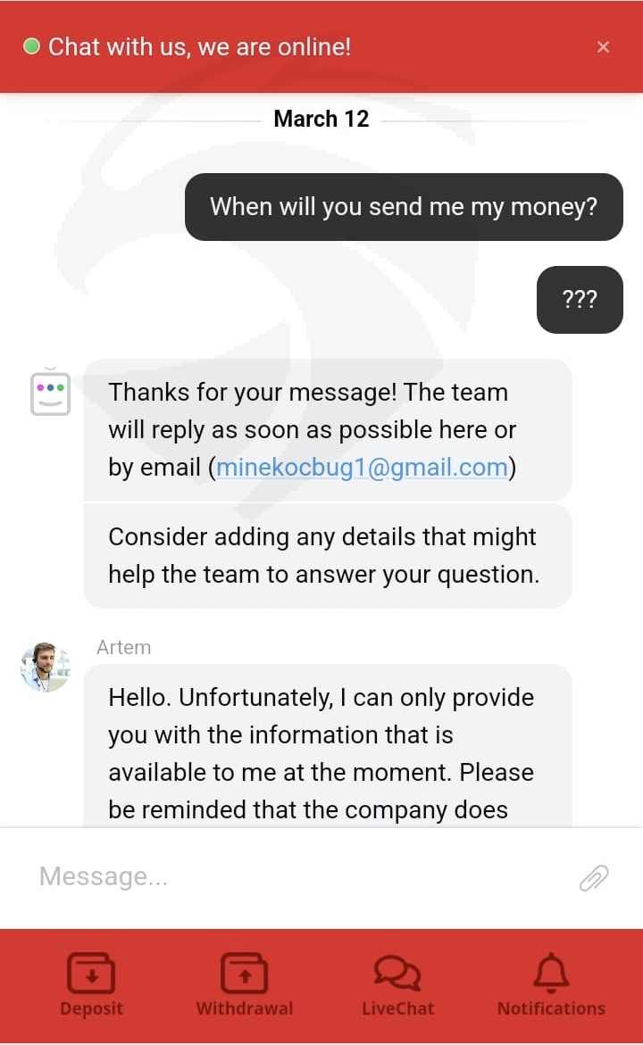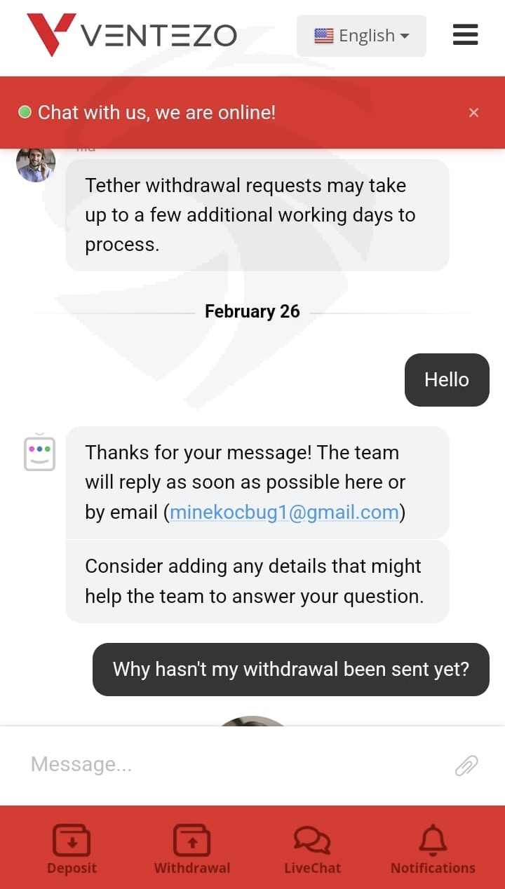 Ventezo公司已经超过30天没有给我寄钱了,他们占用了我的钱30天,当我写给在线支持时,他们首先说我们的加密货币提款出现故障,很快会给你寄钱,然后他们不断说财务部门会尽快退还给你,他们一直告诉我要耐心等待。