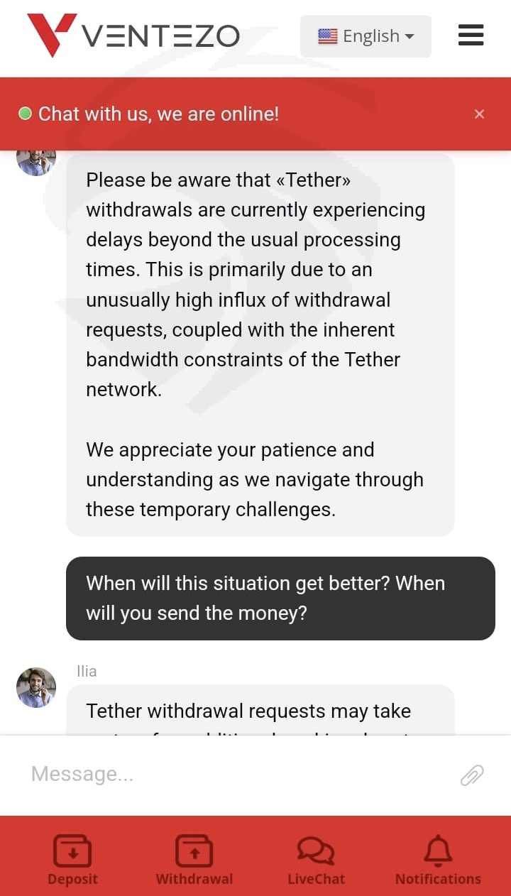 Ventezo company has not sent my money for more than 30 days, it has usurped my money for 30 days, and when I wrote live support, they first said that there was a malfunction in our cryptocurrency withdrawal and that we would send your money soon, and then they constantly say that the finance unit will return to you as soon as possible, and they constantly tell me to be patient and wait