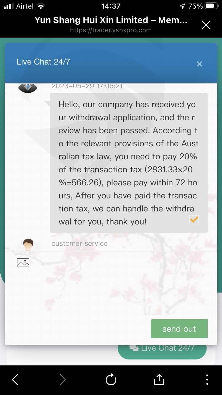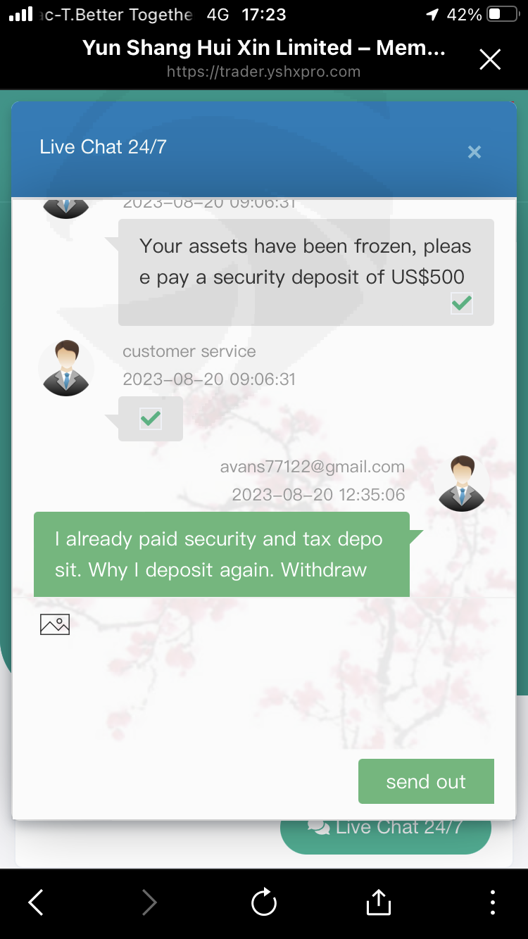 过去 8 个月了,钱一直被卡。共2800 美元,缴纳了税款和所有费用,还是无法出金。我把所有钱都投在这,但拿不回来。出金时,他们要求我交税。我交了 566 美元的税。我需要拿回我的钱,证据都有。他们说我在一天内交易了很多次,所以账户被冻结了。这一点都不合理。一段时间后,他们将我的账户从 Titan转到云上会鑫公司。之后他们说我在一天内多次交易,账户有问题,让我交500 美元检查费。但我拒绝了,他们说不入金我们就不出金。过了一段时间,他们说会在一段时间后给我出金。但现在他们把我账户禁了。