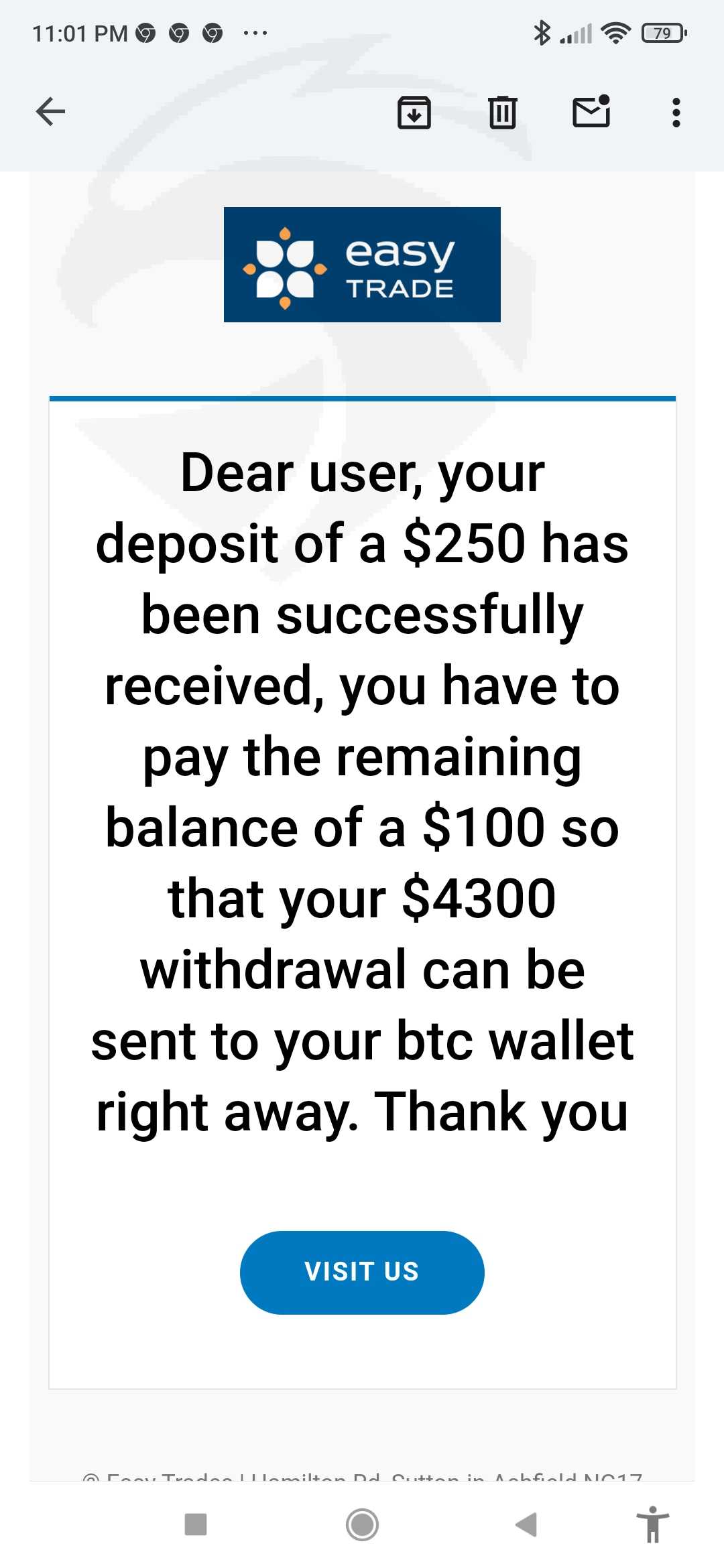 We started with TradeTech and continued with Easy Trades and they asked for a deposit of $350 which was paid first $250 and then $100 one after the other on the same day within minutes of each other. Below is a letter from Easy Trades after making the deposits. They are saying that they did not get the $100 deposit and want me to redeposit another $100. It's all a SCAM!!