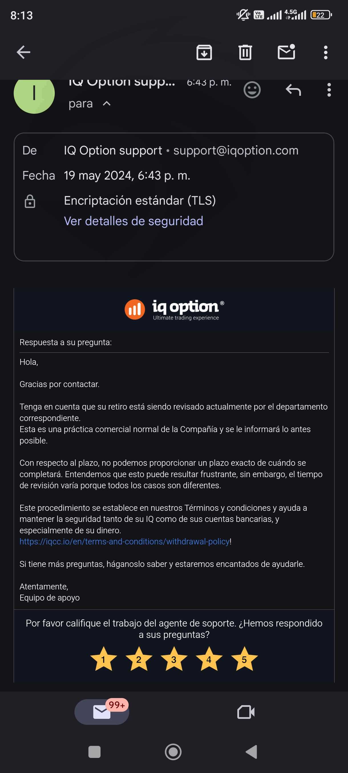 我曾经是一个VIP用户,甚至有一个账户顾问,当我开始盈利时,我的盈利百分比下降了,我停止成为VIP用户后,账户顾问消失了,他们还禁用了支持选项,所以我无法联系支持部门了解发生了什么情况,由于这种情况,我于2024年5月16日提取了2778美元,看到提款显示正在审核中,请咨询,他们告诉你正在审核中,并且他们没有处理我的提款的截止日期。希望这种情况不会发生在其他人身上。