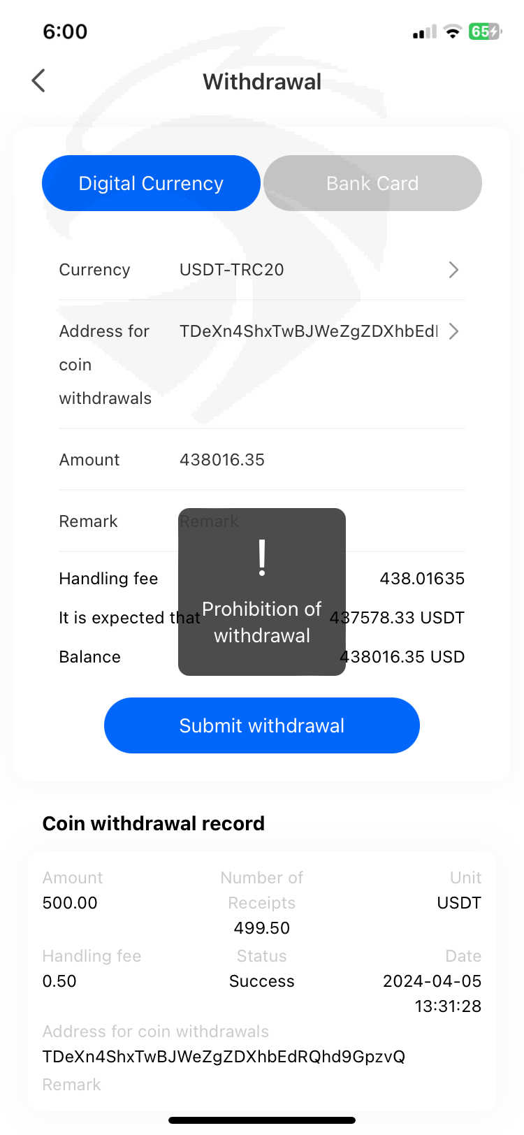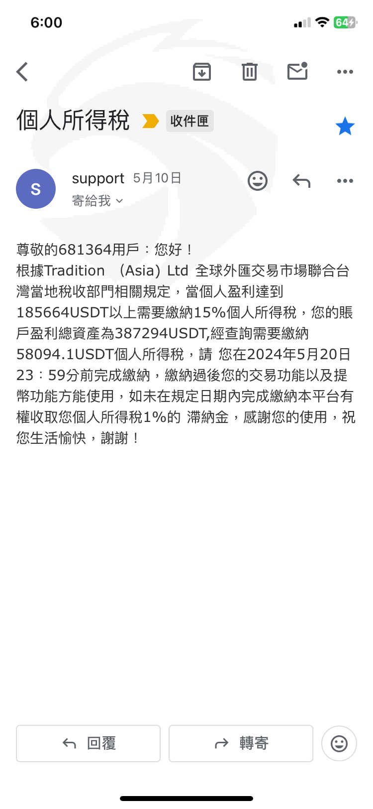 謊稱因獲利超過USDT185664,需繳交15%個人所得稅,並限制出金!
