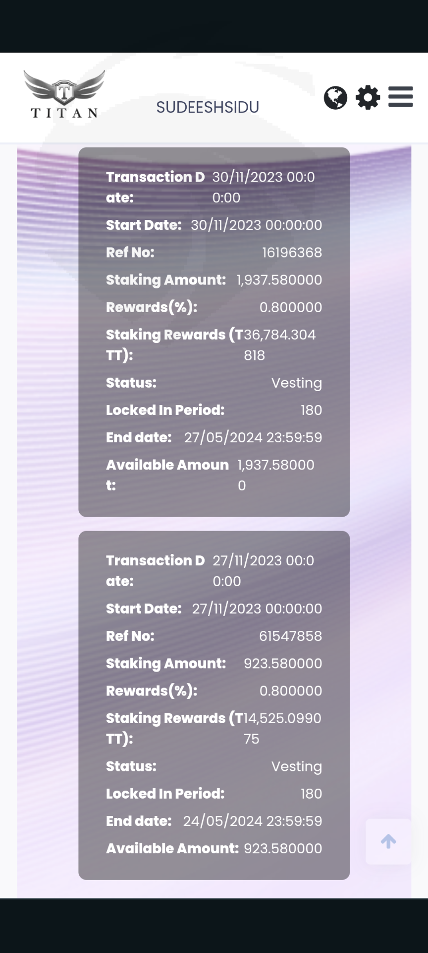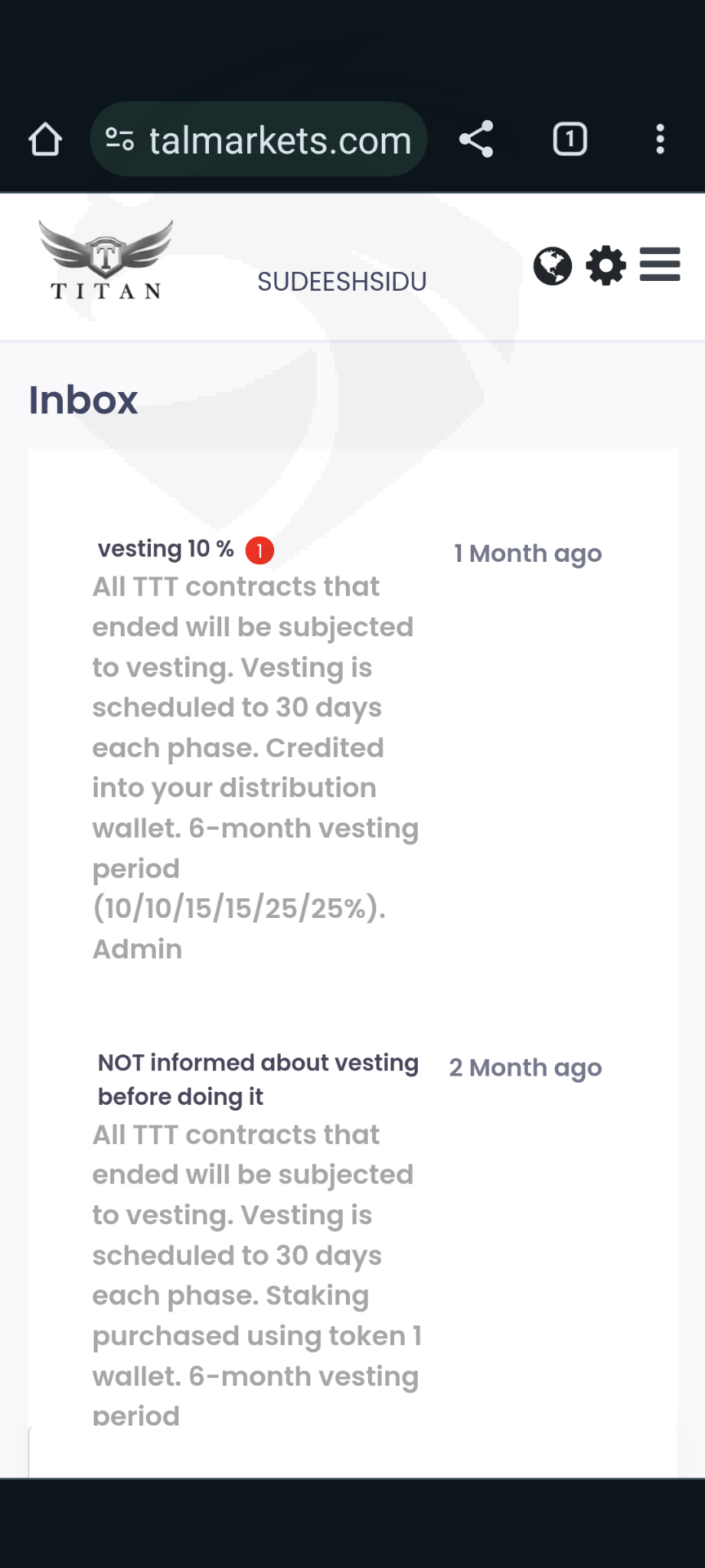 I invested 8000 USDT in the Titan capital market but I can't withdraw the TTT form the distribution wallet and Royalties wallet,,they haven't given the access for the withdrawal form distribution wallet,,,also the TTT rate they made it zero and they had done vesting of my fund and not releasing after the contract.I would like you to get compensation form them and return back my full money as soon as possible. My account user name is Sudeeshsidu